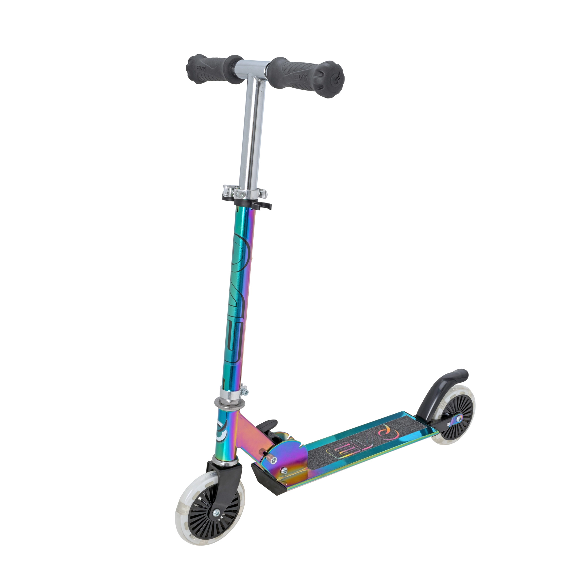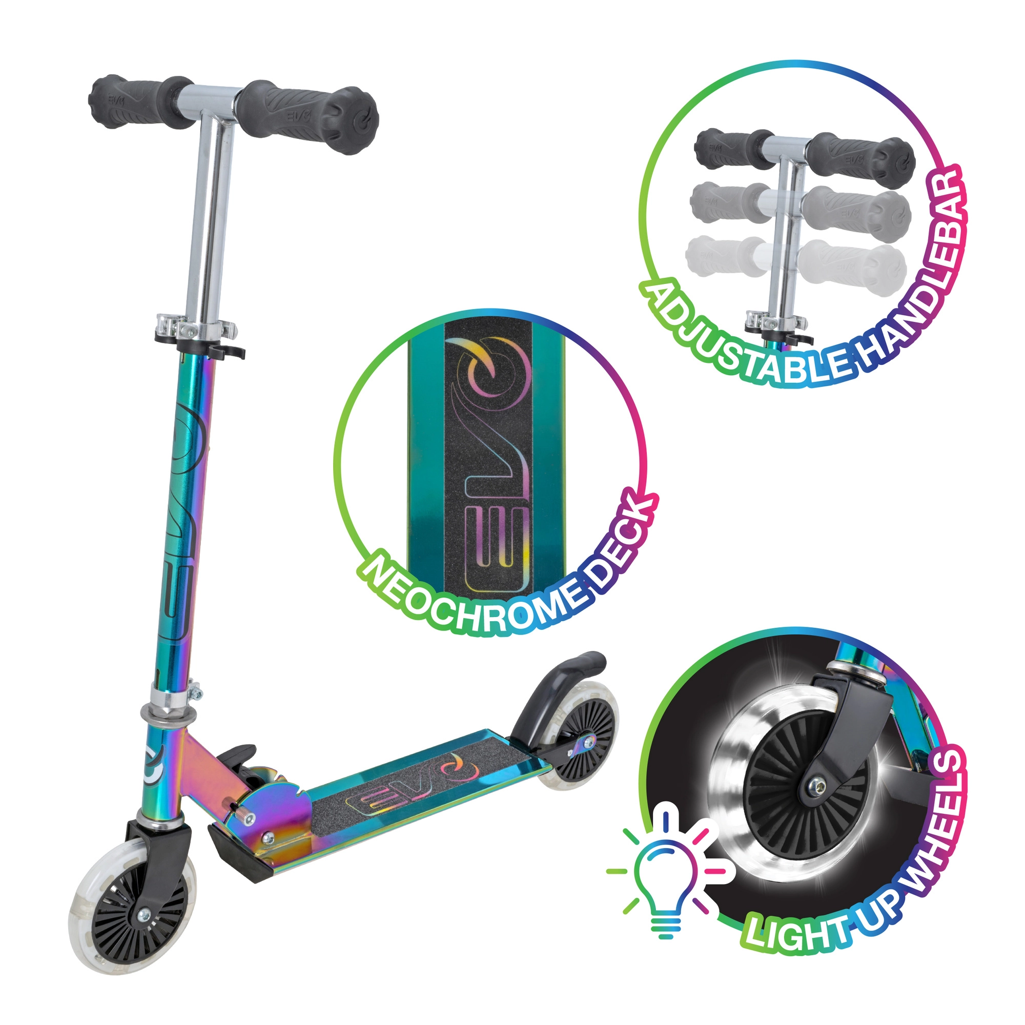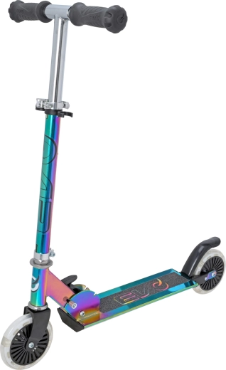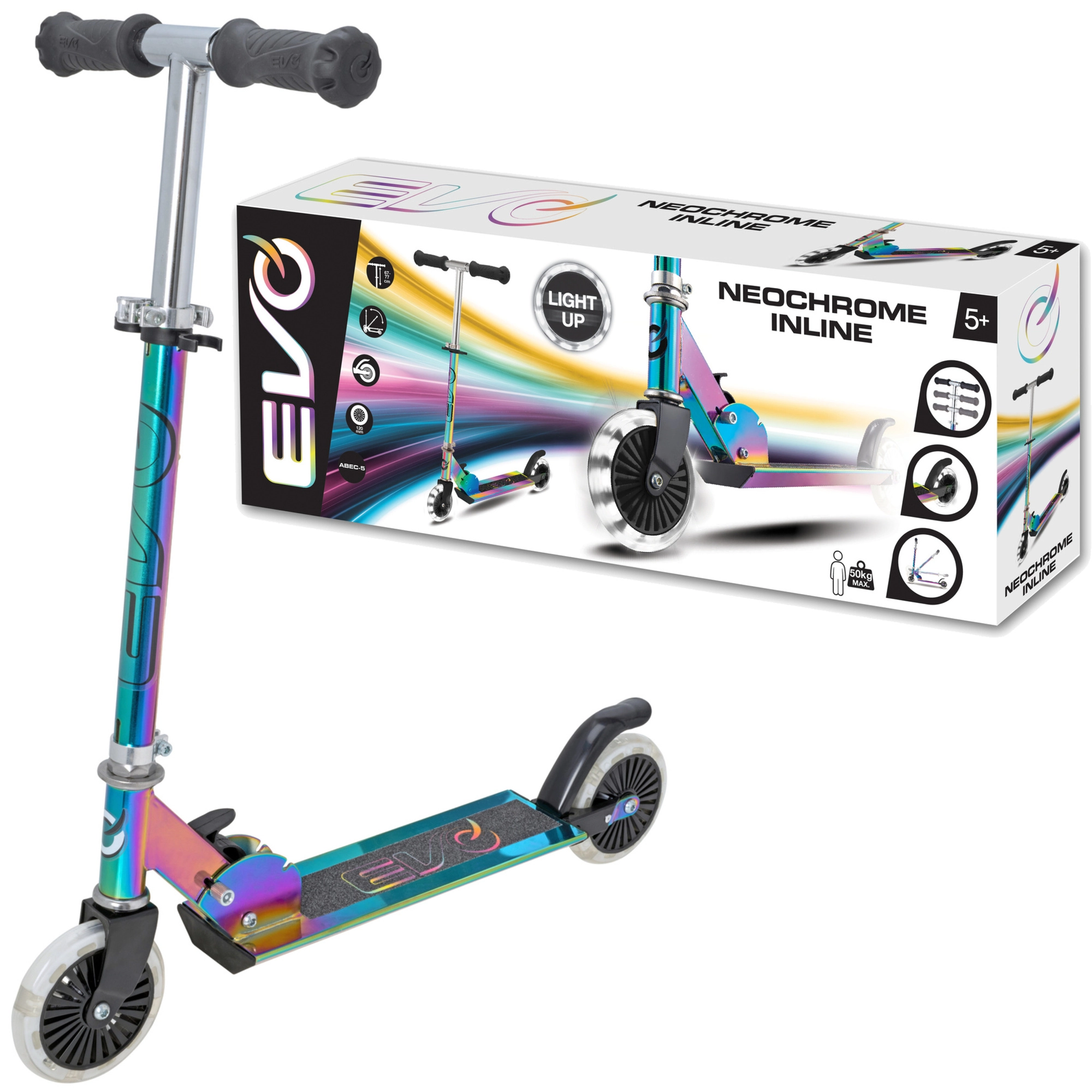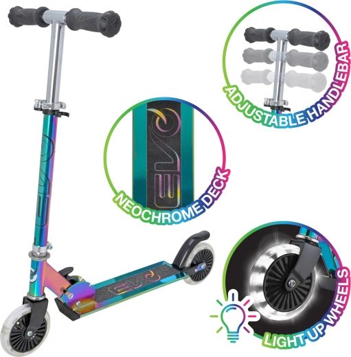 Koloběžka EVO Light Up Neochrome je skvělou volbou pro malé jezdce, kteří chtějí vyniknout. Díky nastavitelným řídítkům (cca 67–77 cm) roste s dítětem, skládací mechanismus usnadní přenášení i skladování a odolná kovová konstrukce s protiskluzovou nášlapnou plochou dodá jistotu při jízdě.