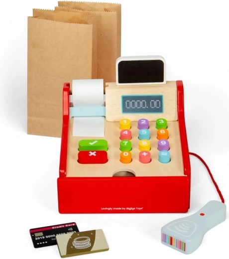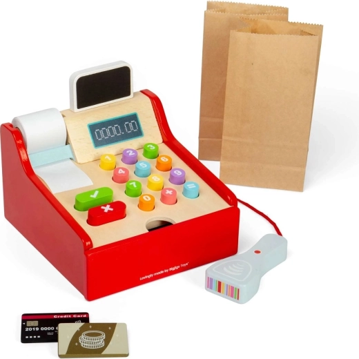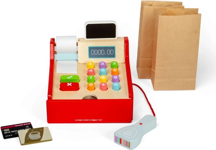 Dopřejte dětem autentický zážitek z nakupování. Dřevěná pokladna BIGJIGS TOYS nabízí barevná, snadno stisknutelná tlačítka, ruční skener, prostor pro účtenky a zásuvku na „peníze“. Realistické prvky podněcují představivost a přirozeně vedou k procvičování počítání i jednoduchých plateb.