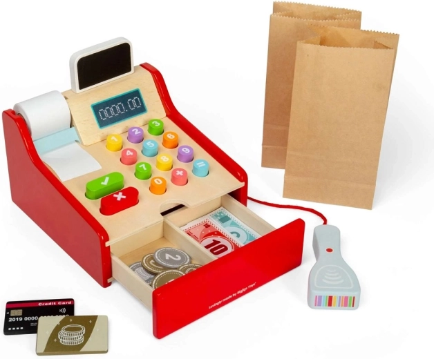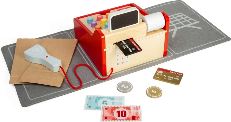 - Dřevěná pokladna, ruční skener, zásuvka na mince a bankovky, hrací hotovost, platební karta, papírové tašky