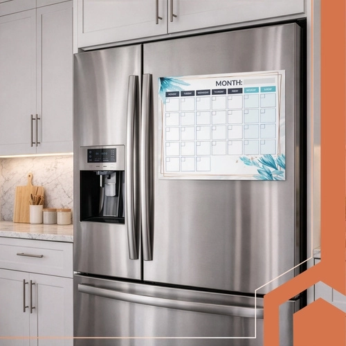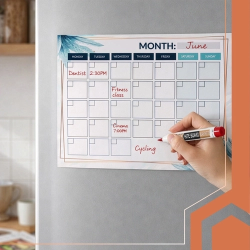 Sucho stíratelný povrch umožňuje opakované psaní a mazání bez nepořádku. Silná magnetická zadní strana zajistí stabilní uchycení na lednici nebo jiné kovové ploše. Praktická sekce poznámek udrží důležité informace stále po ruce a barevné popisovače zvýrazní priority.