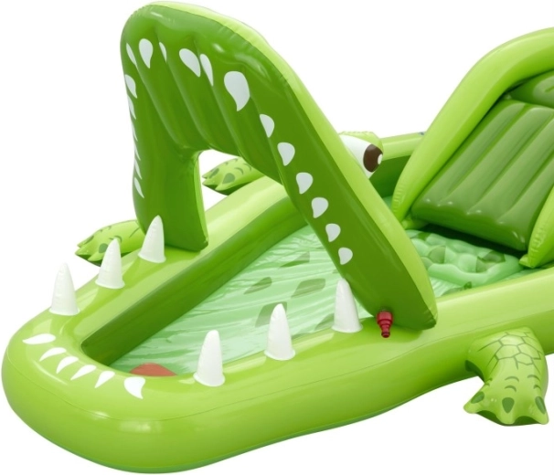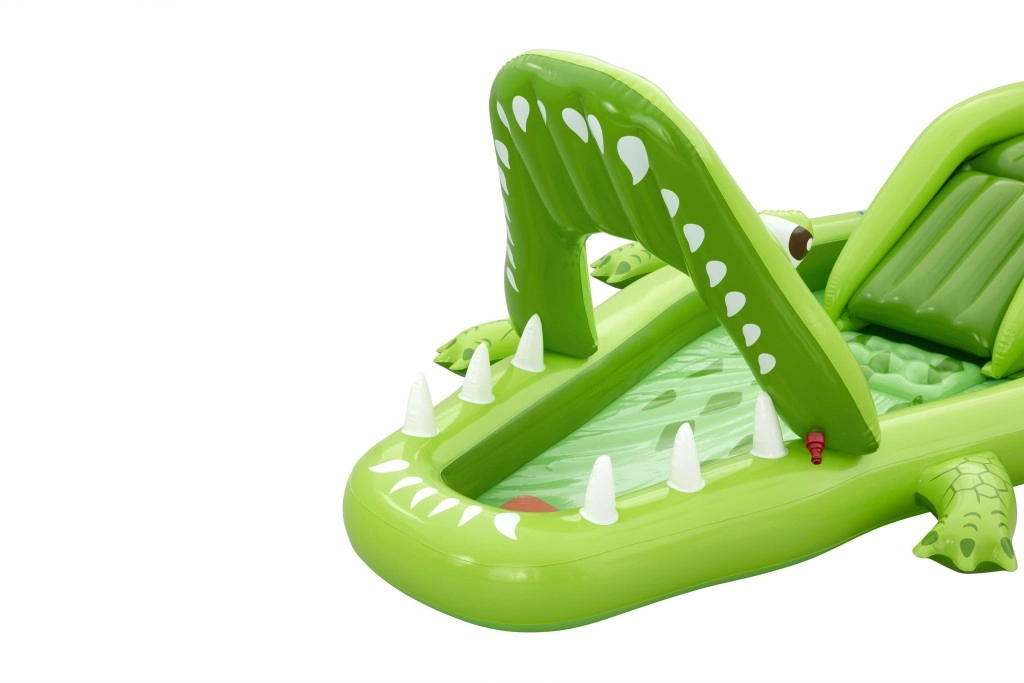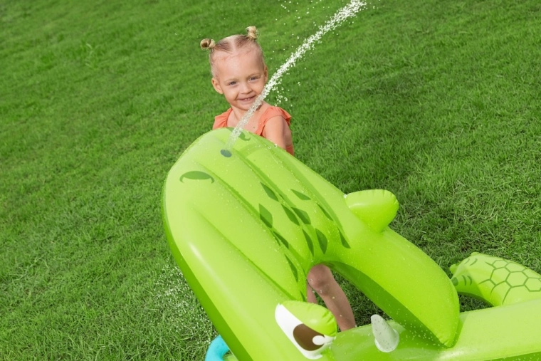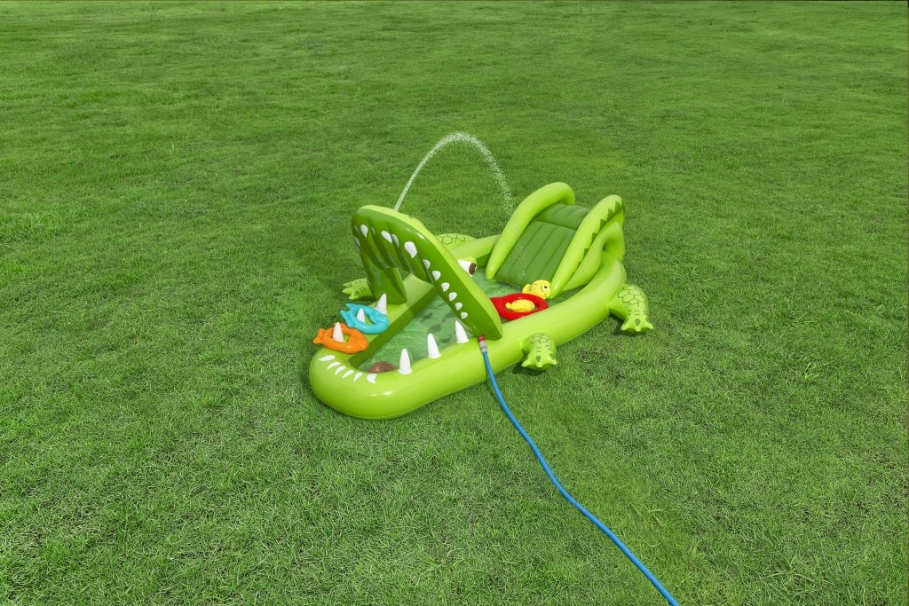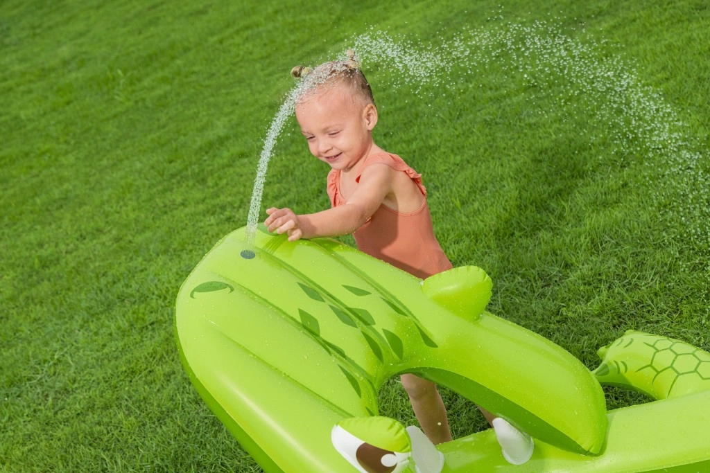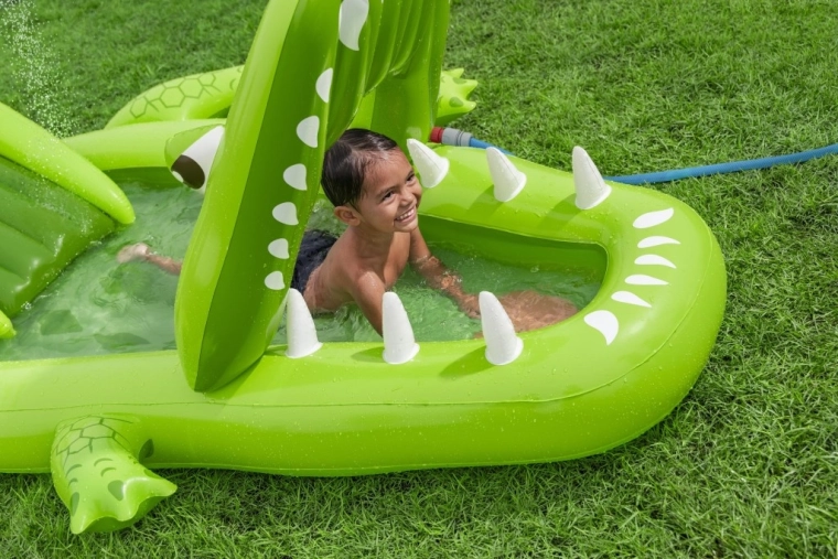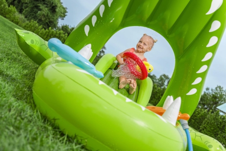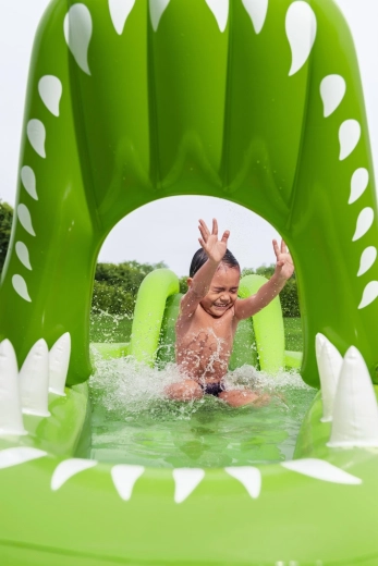 Toto nafukovací hrací centrum ve tvaru aligátora přináší dětem hodiny aktivní zábavy na zahradě. Reálný design s „tlamou–bránou“ motivuje ke hře, prolézání i sklouzávání, zatímco vodní rozstřikovač připojitelný k zahradní hadici vytváří jemnou spršku směrem na skluzavku pro extra klouzavost a ochlazení.