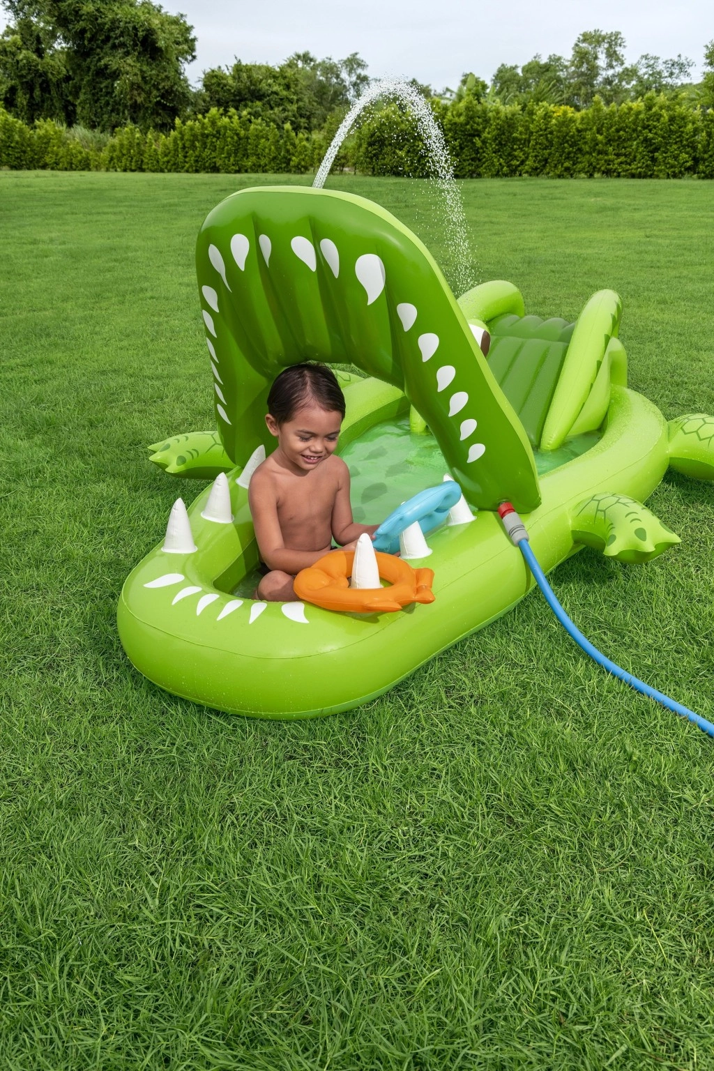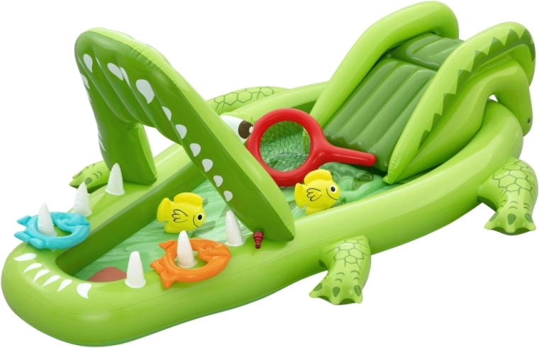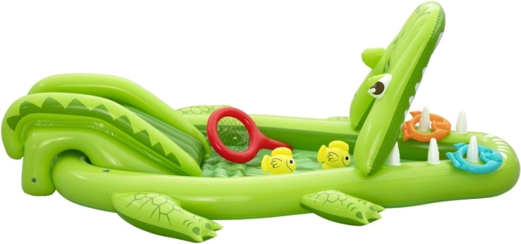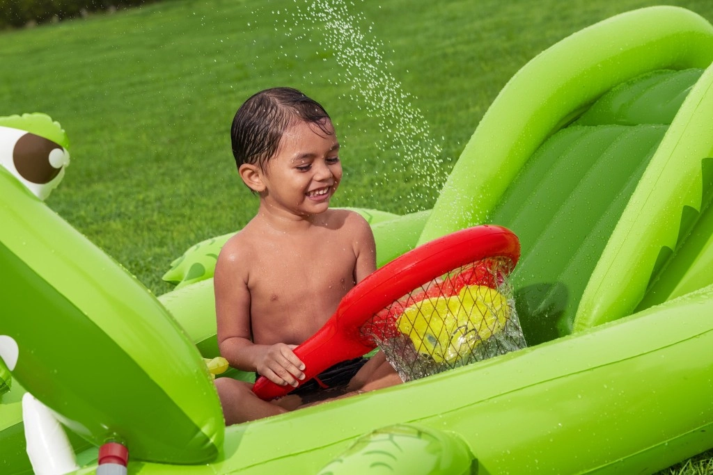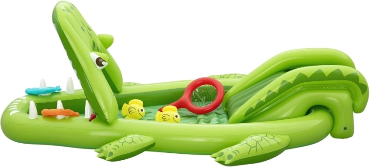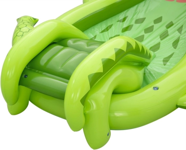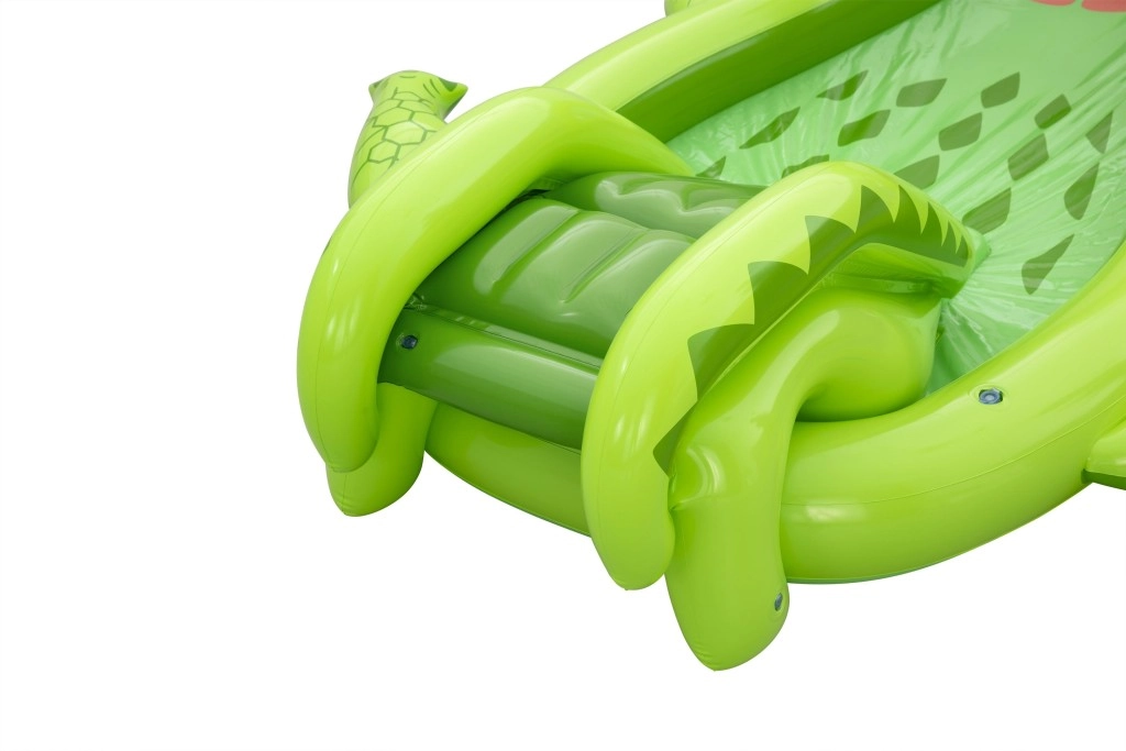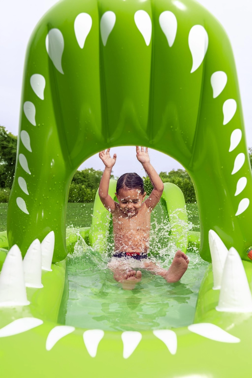 Toto nafukovací hrací centrum ve tvaru aligátora přináší dětem hodiny aktivní zábavy na zahradě. Reálný design s „tlamou–bránou“ motivuje ke hře, prolézání i sklouzávání, zatímco vodní rozstřikovač připojitelný k zahradní hadici vytváří jemnou spršku směrem na skluzavku pro extra klouzavost a ochlazení.