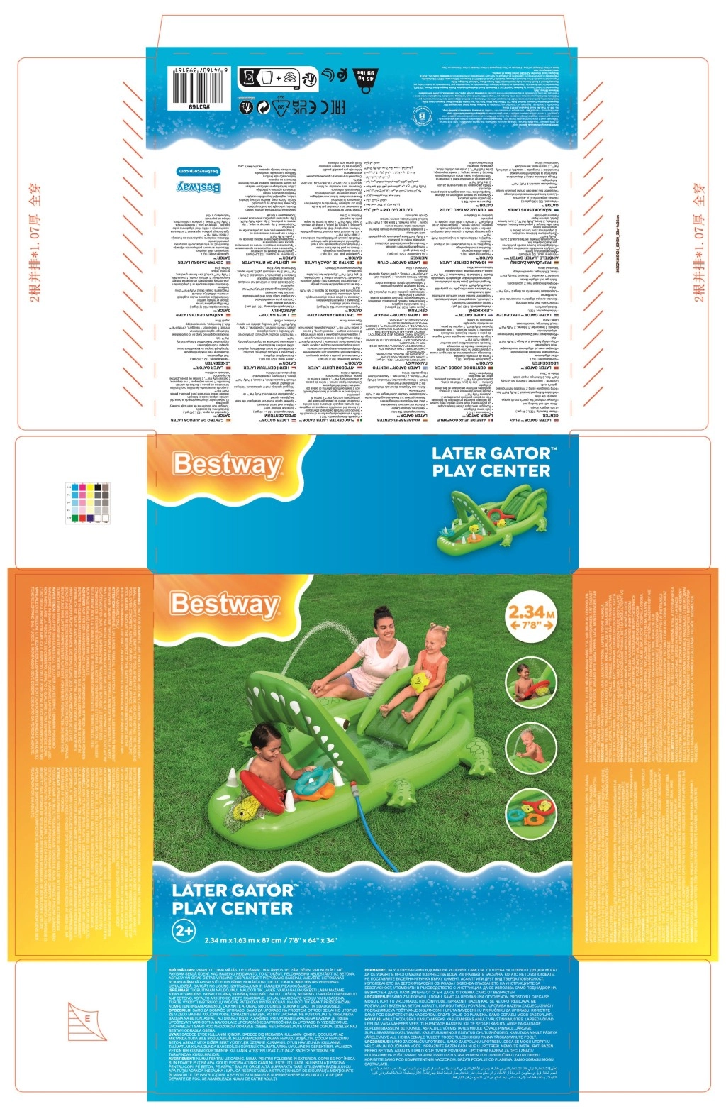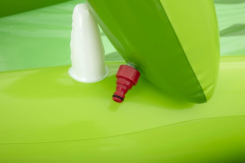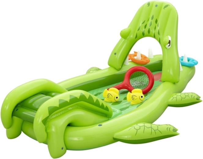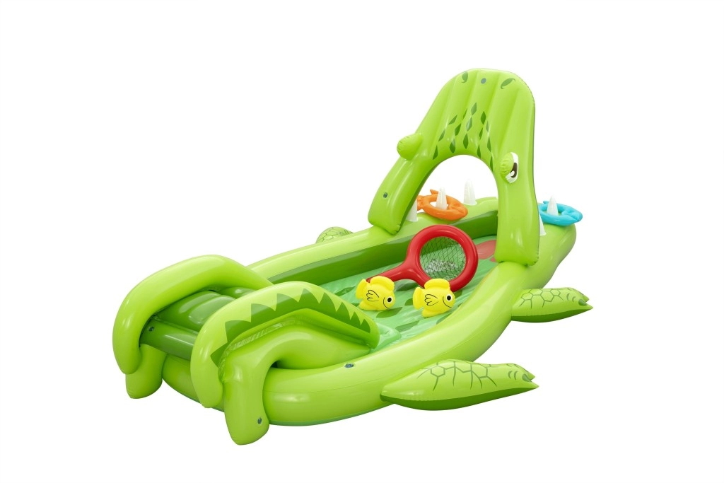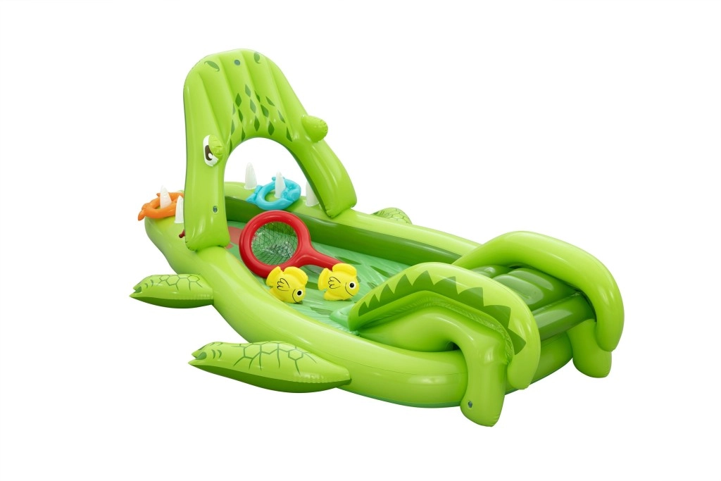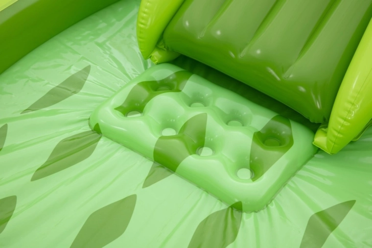 Toto nafukovací hrací centrum ve tvaru aligátora přináší dětem hodiny aktivní zábavy na zahradě. Reálný design s „tlamou–bránou“ motivuje ke hře, prolézání i sklouzávání, zatímco vodní rozstřikovač připojitelný k zahradní hadici vytváří jemnou spršku směrem na skluzavku pro extra klouzavost a ochlazení.
