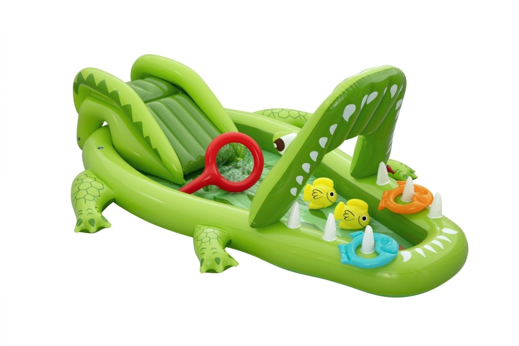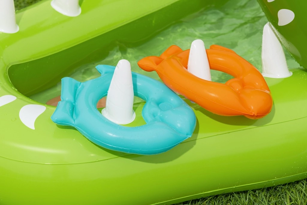 Bezpečnost a pohodlí zajišťují měkké nafukovací stěny a polstrovaná přistávací zóna pod skluzavkou. Součástí balení jsou doplňky pro dovednostní hry – dvě rybičky, dva nafukovací rybí kroužky a podběrák, se kterými děti trénují koordinaci, chytání i házení kroužků na „zuby“ aligátora.
