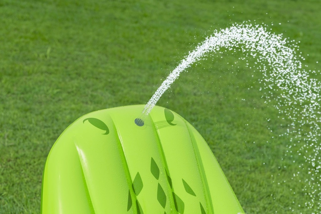 Integrovaný rozstřikovač na „hlavě“ aligátora po připojení k hadici vytváří jemný proud směrem na skluzavku – děti se kloužou lépe a zůstanou v chladu.