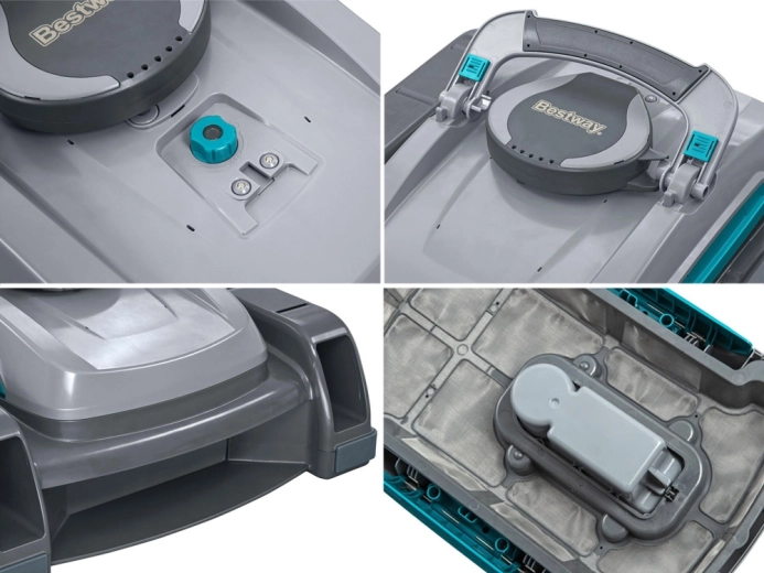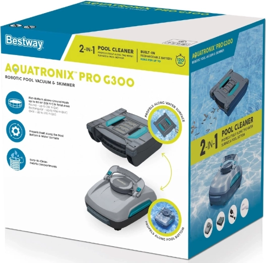 BESTWAY Aquatronix Pro G300 je moderní, plně automatický bezdrátový robot 2v1, který čistí dno bazénu i hladinu vody. Díky vestavěné baterii pracuje až 120 minut, bez zamotaných kabelů. Velké koše na nečistoty (3,5 l pro dno a 6 l pro hladinu) a chytré senzory pro automatické spuštění/vypnutí zajišťují pohodlnou, bezpečnou a efektivní údržbu zejména nadzemních bazénů s rovným dnem.