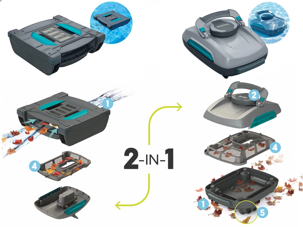 Dva snadno vyměnitelné moduly umožní vysávání dna a skimmer sběr nečistot z hladiny. Udržujte bazén kompletně čistý bez dalších zařízení.