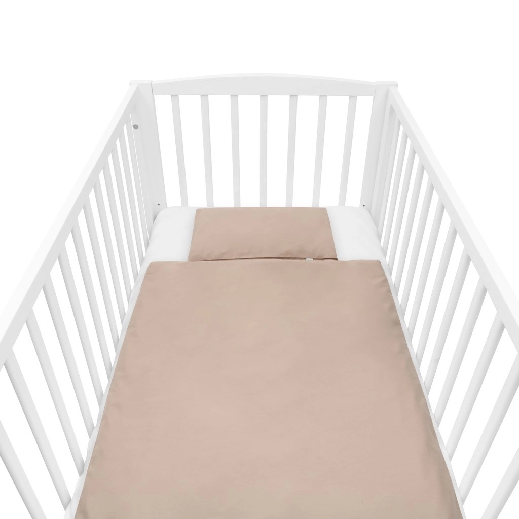 Měkoučká dětská souprava do postýlky v barvě cappuccino obsahuje polštářek a peřinku s antialergickou výplní. Povlak z 100% bavlny je jemný k citlivé pokožce, výplň o výšce 3 cm krásně hřeje i v chladnějších dnech. Praktická snadná údržba – praní v pračce.