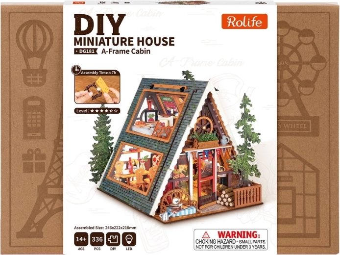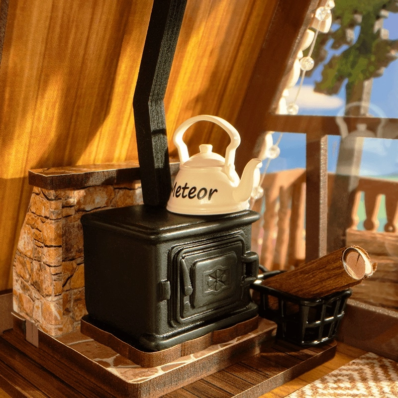Vytvořte si atmosféru moderního glampingu přímo doma. Model chaty se sedlovou střechou zaujme velkými prosklenými stěnami, otevíratelným oknem a promyšleným interiérem: slunný obývací prostor, plně vybavená jídelna, dřevěné schodiště a podkrovní ložnice. Nechybí balkon s minizahrádkou, dřevěná pec, dekorativní rámy ani kytara – každý detail potěší milovníky miniatur.