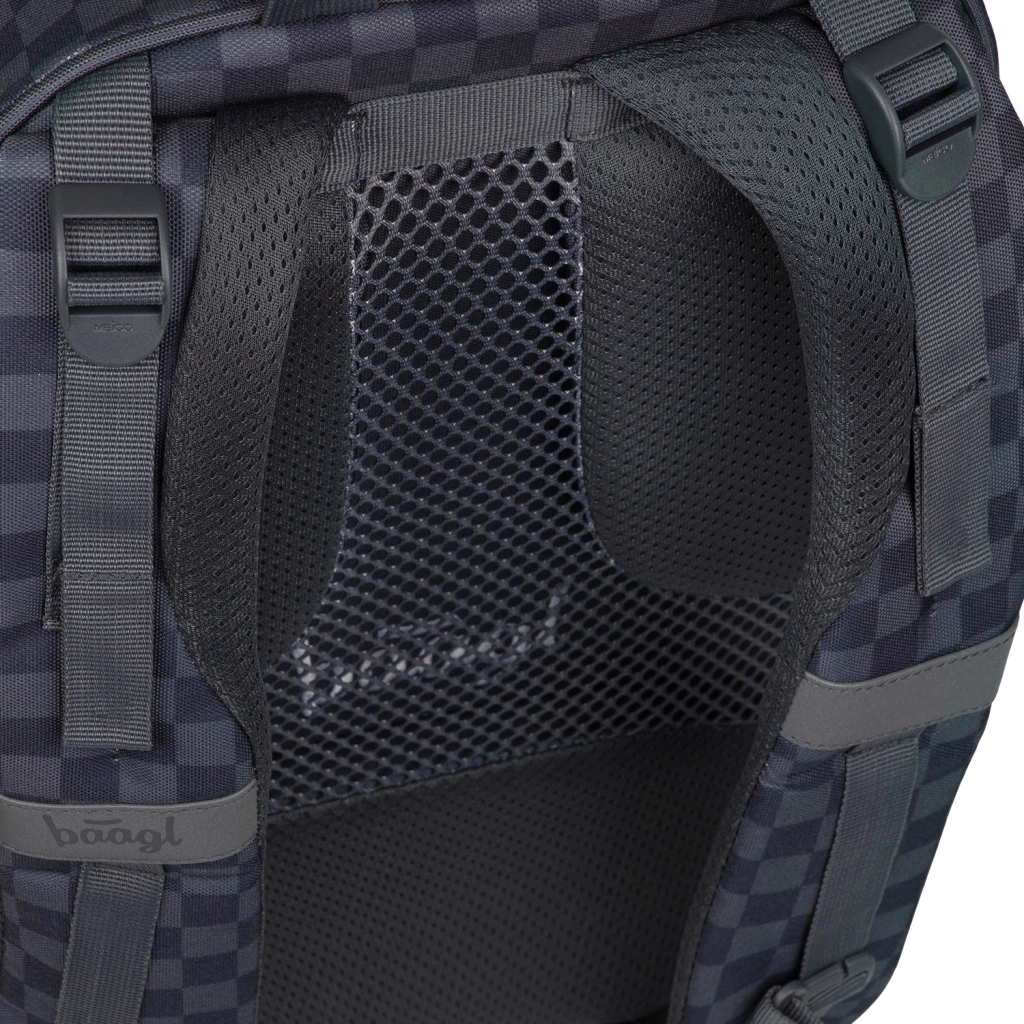 BAAGL Core Ska je promyšlený školní batoh pro každodenní nošení. Díky ergonomickému tvarování zad s ventilací, nastavitelným a polstrovaným ramenním popruhům a hrudnímu popruhu rozkládá zátěž rovnoměrně a zajišťuje pohodlí po celý den. Lehká konstrukce s objemem 25 l pojme učebnice, sešity i notebook do 15".