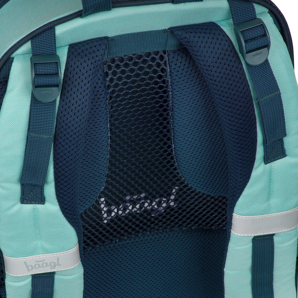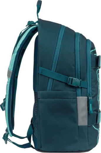 BAAGL Skate Petrol GRS kombinuje moderní design, ergonomii a udržitelnou výrobu. Anatomicky tvarovaná záda s výztuží v oblasti beder a prodyšné polstrování zajišťují celodenní komfort. Díky plně nastavitelným kompresním popruhům se batoh skvěle přizpůsobí postavě a stabilně drží náklad.