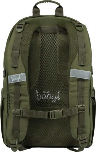Praktická školní sada BAAGL ve stylu Olive spojuje lehké a odolné provedení, ergonomický batoh se skateboard popruhy, prostorný penál a skládací sportovní tašku. Ideální pro žáky od 3. třídy – z recyklovaných, voděodolných materiálů s certifikací GRS a bezpečnými reflexními prvky.