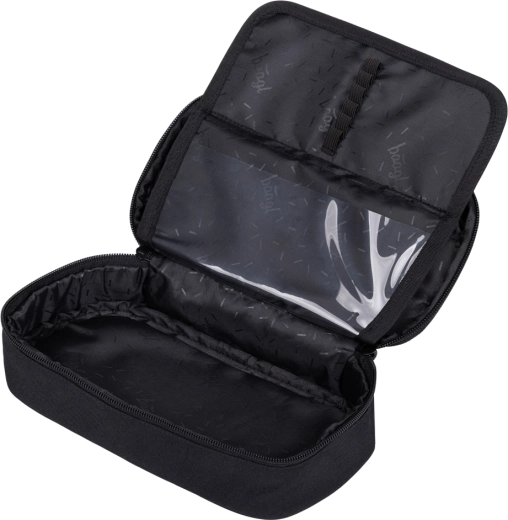 Prostorný penál s výklopnými chlopněmi a vnitřní kapsou, sáček z omyvatelného materiálu se stahováním na záda. Vše v recyklovaném materiálu s certifikací GRS.