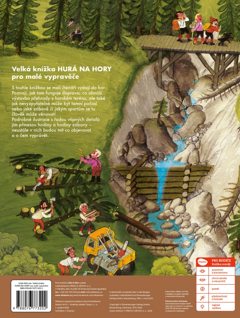 Vydejte se s dětmi na dobrodružnou výpravu do hor. Tato velkoformátová kniha s bohatými a podrobnými ilustracemi představuje, jak to v horách funguje – od každodenního života a práce místních až po turistiku, lyžování a další aktivity, které si užijí návštěvníci. Díky množství zábavných detailů si děti budou stále nacházet nové věci k objevování a vyprávění.
