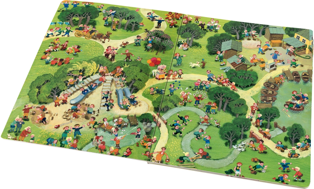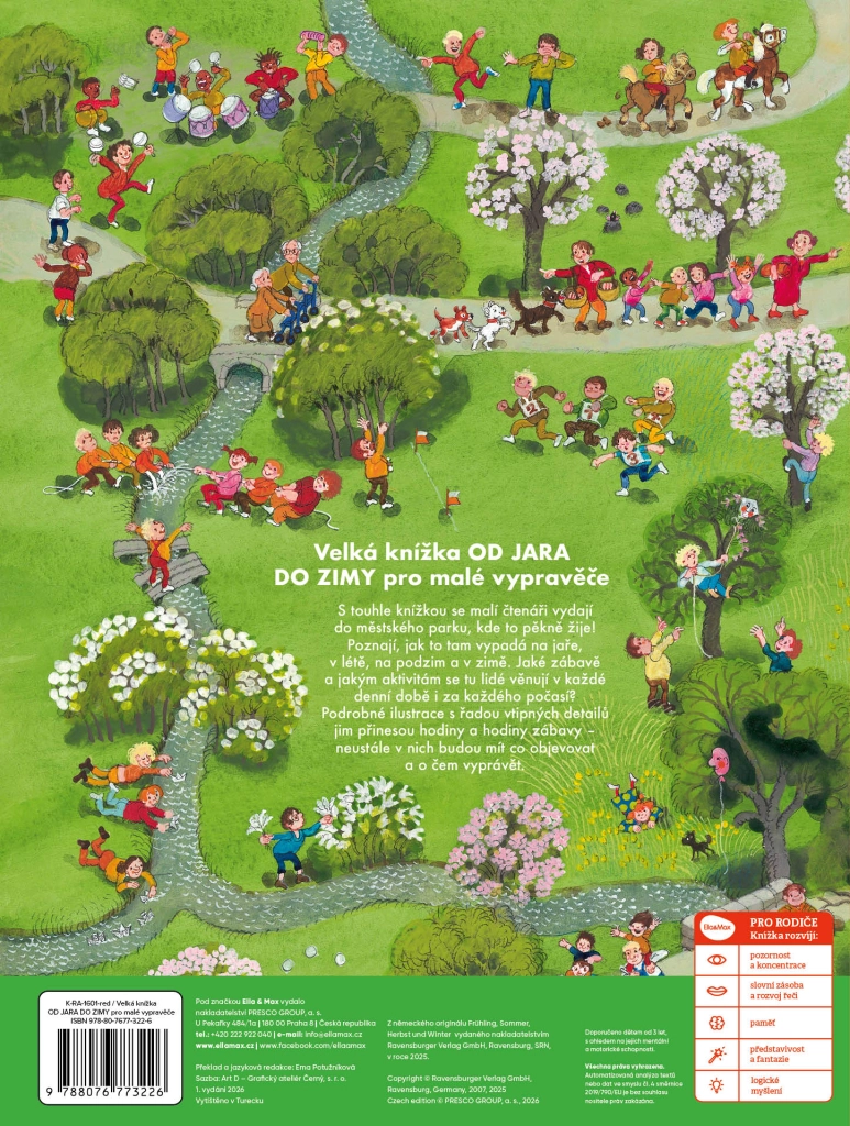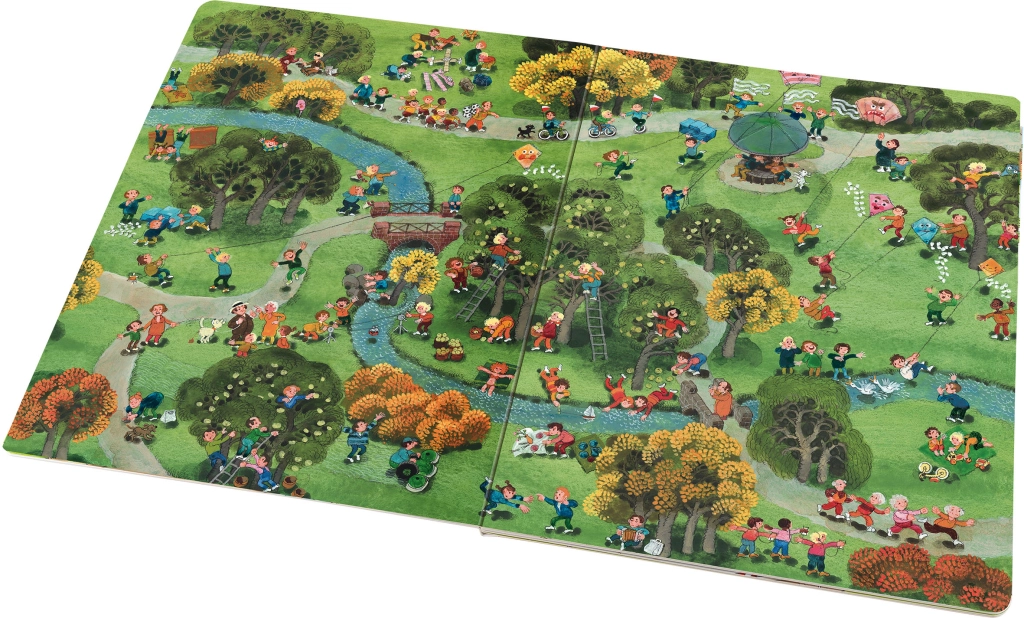 Tato velkoformátová obrázková kniha provede děti rušným městským parkem napříč čtyřmi ročními obdobími – jarem, létem, podzimem a zimou. Každá stránka je plná drobných příběhů, aktivit a postaviček, které se mění podle času dne i počasí. Díky bohatým ilustracím děti stále objevují nové souvislosti a rozvíjejí schopnost pozorování.