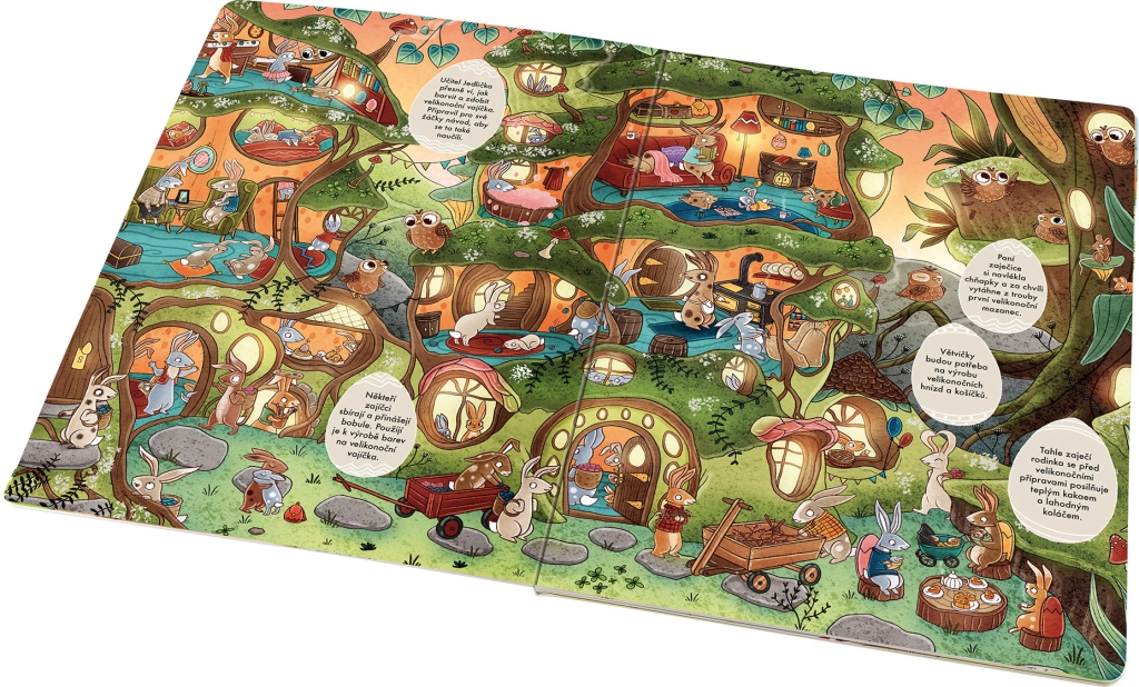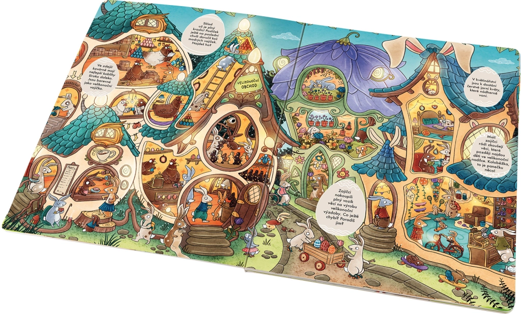 Na každé stránce děti objeví několik velikonočních vajíček s krátkými texty, úkoly a drobnými výzvami. Díky tomu je kniha ideální pro společné čtení i samostatné objevování.