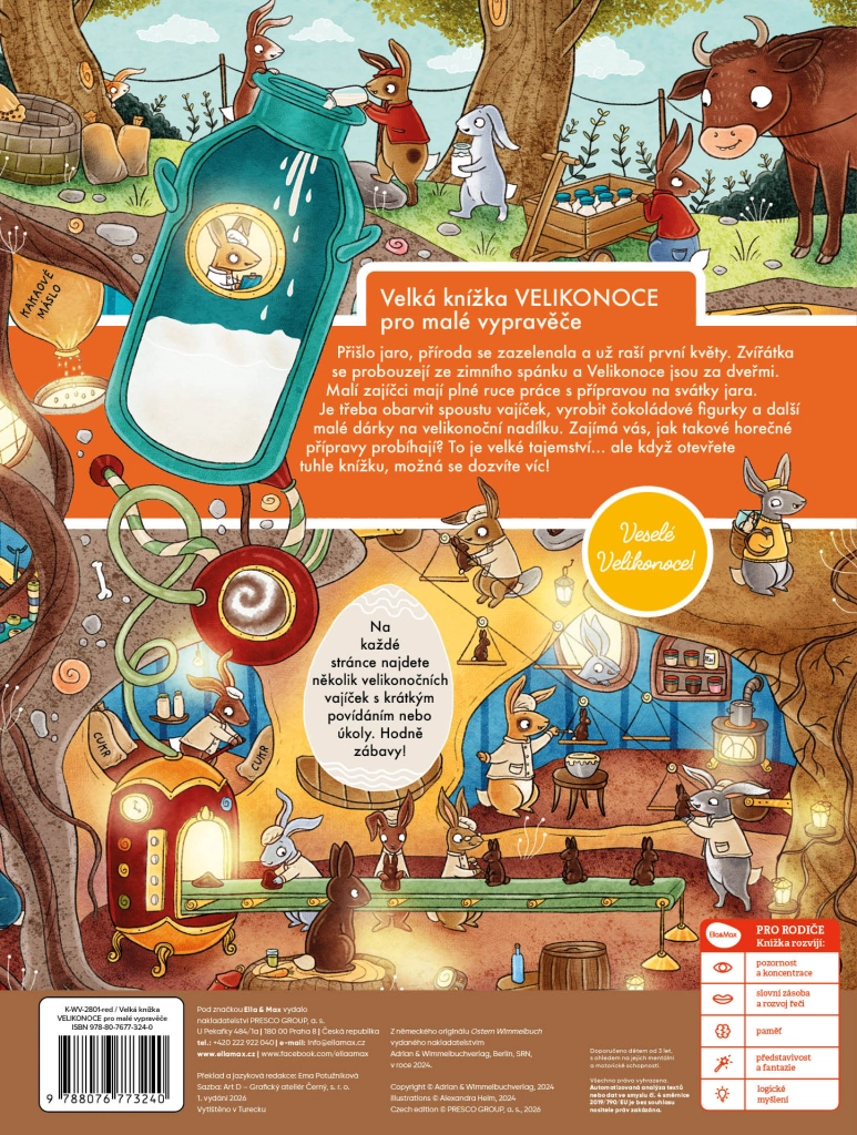 Tato krásně ilustrovaná knížka přináší dětem jarní náladu a přibližuje tradice Velikonoc zábavnou formou. Zajíčci mají plné tlapky práce – barví vajíčka, připravují nadílku a chystají překvapení. Děti mohou nahlédnout do jejich tajemného světa a přitom si hravou formou procvičit čtení a soustředění.