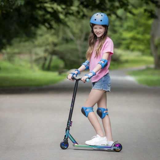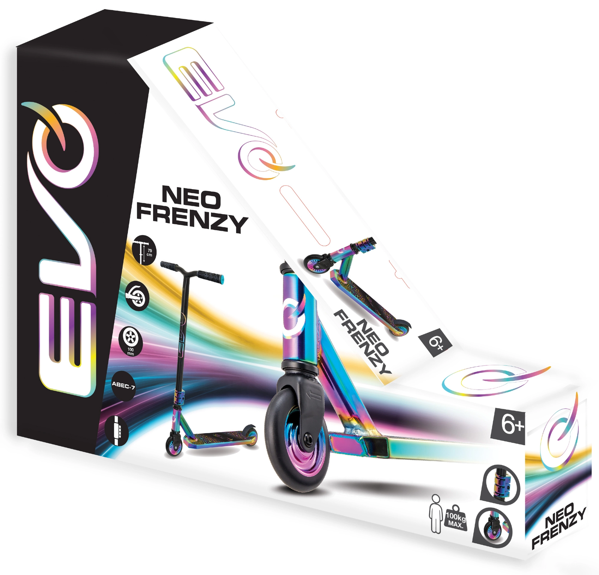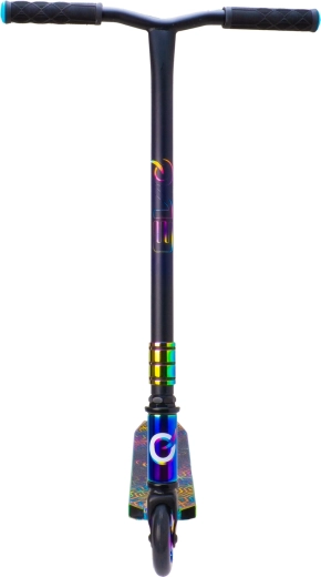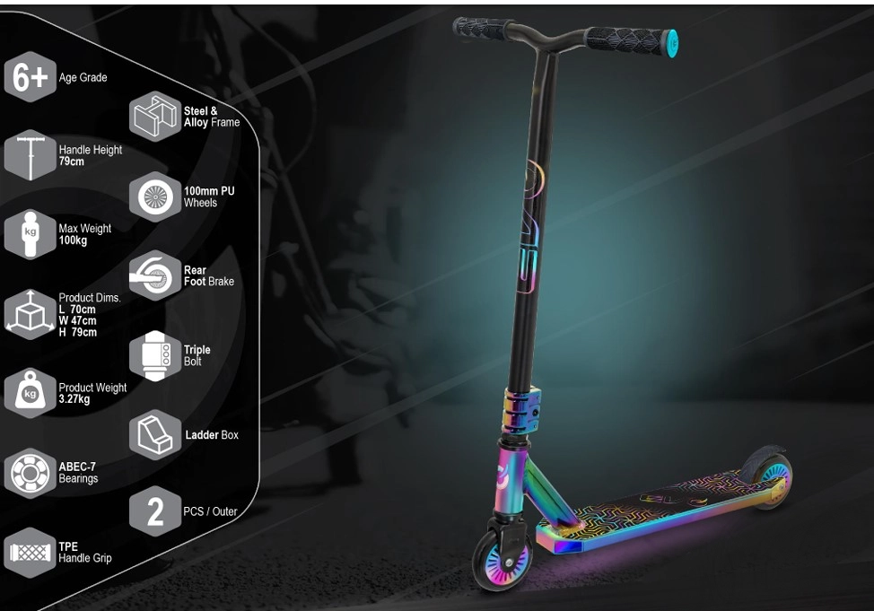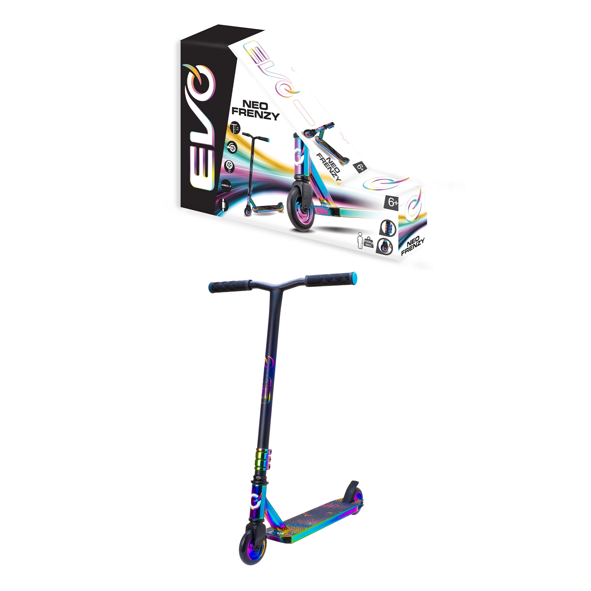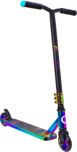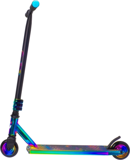 Stylová freestylová koloběžka EVO Neo Frenzy pro děti od 6 let nabízí pevnou konstrukci pro triky, hladkou jízdu díky ložiskům ABEC-7 a atraktivní duhový neo-chrome vzhled. Nechybí T-bar řídítka s pohodlnými gripy, zadní nášlapná brzda a kovové jádro koleček pro stabilitu a jistotu v parku i ve městě.