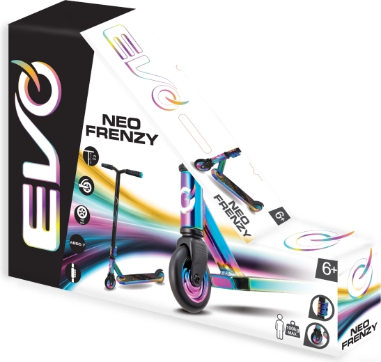 EVO Neo Frenzy je dětská stunt koloběžka navržená pro učení rovnováhy a prvních triků. Pevný kovový deck s protiskluzovou grip páskou a odolná vidlice zajišťují stabilitu, zatímco malá tvrdá kolečka s ložisky ABEC-7 přinášejí rychlé zrychlení a plynulou jízdu. Výrazné neo-chrome detaily upoutají pozornost a dodají koloběžce jedinečný styl.