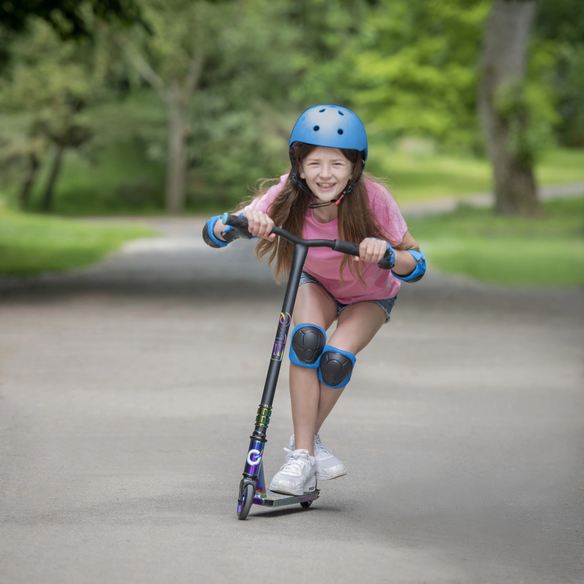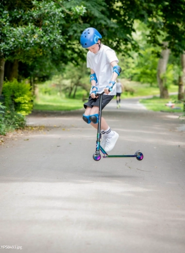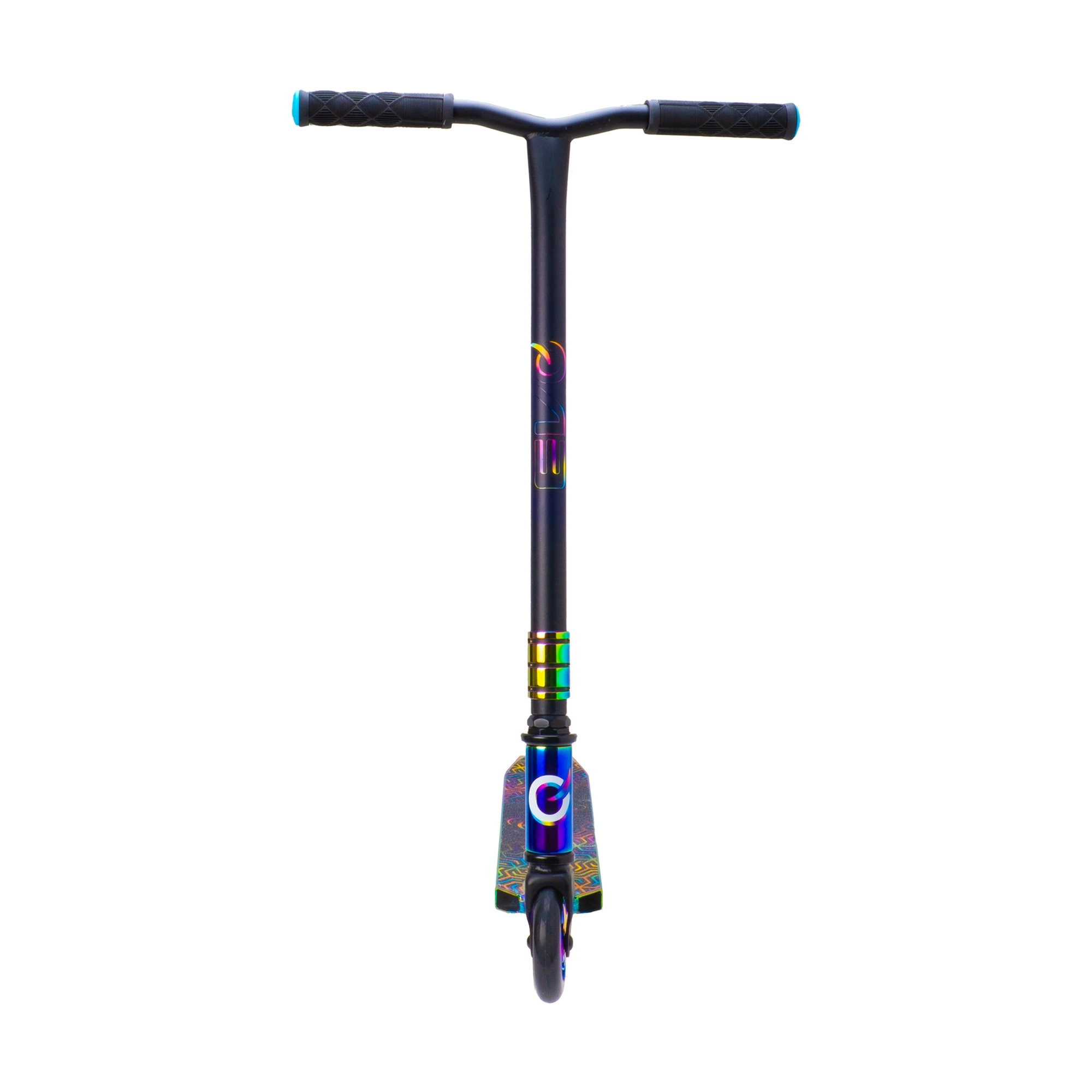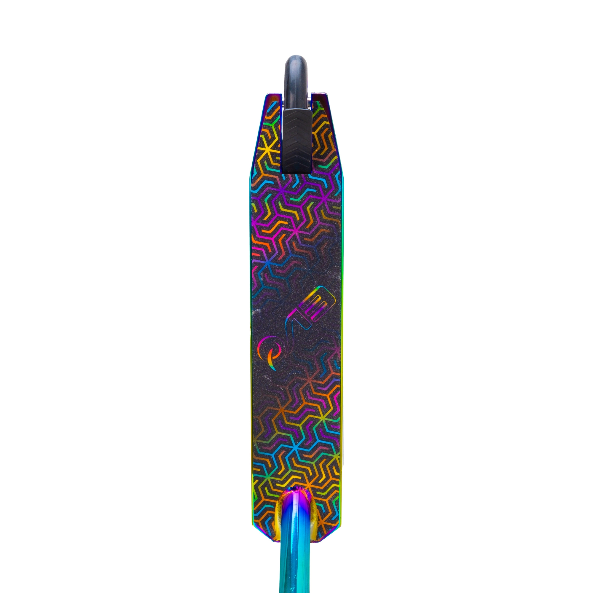 Iridescentní (duhové) provedení decku, vidlice a objímky dodává koloběžce nezaměnitelný vzhled a motivuje k jízdě.