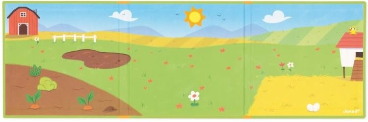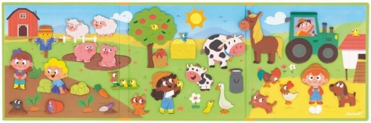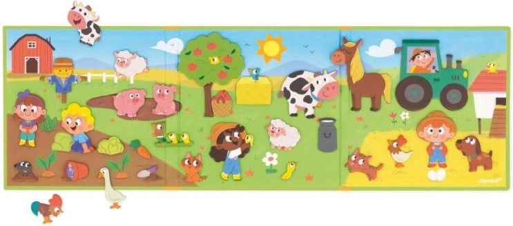 Magnetická kniha Farma Janod přináší zábavu i učení v jednom. Děti si z 30 magnetek se zvířátky a farmářskými motivy poskládají vlastní scénky na velkém magnetickém pozadí. Hra podporuje představivost, vyjadřování i jemnou motoriku a zabaví na dlouhou dobu doma i na cestách.