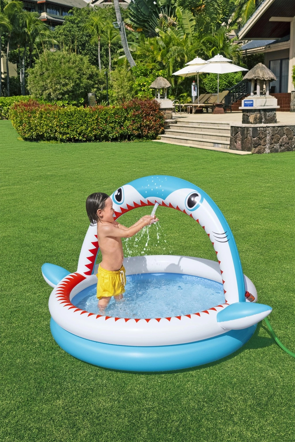 Oblouková „žraločí tlama“ rozstřikuje vodu po připojení zahradní hadice a promění bazének v zábavné vodní hřiště.