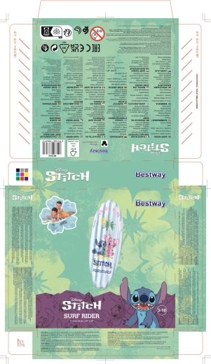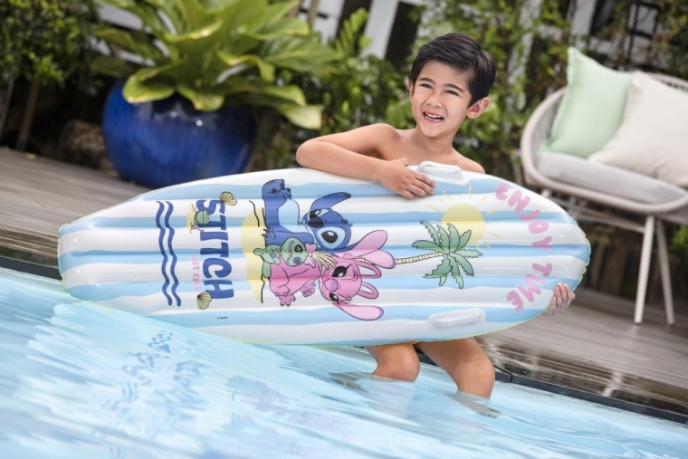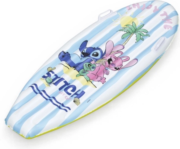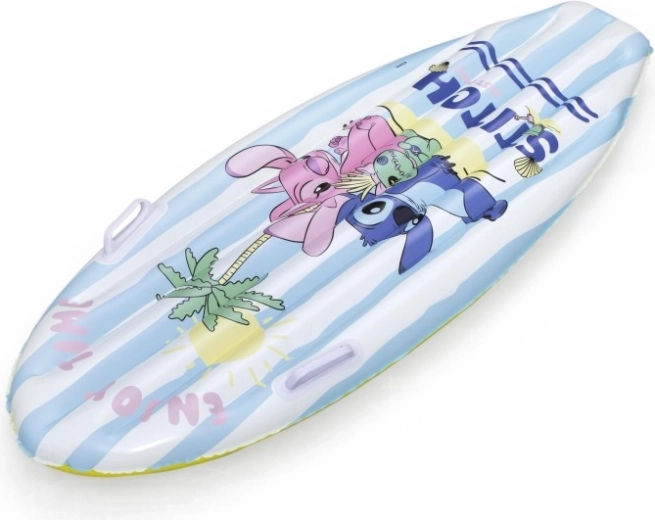 Nafukovací surfovací plovák s motivem DISNEY Stitch nadchne děti veselou grafikou s palmami, sluncem a mušlemi. Modrobílé pruhy na horní straně a žluté dno zvyšují viditelnost na vodě, zatímco nízká hmotnost usnadňuje přenášení i manipulaci.