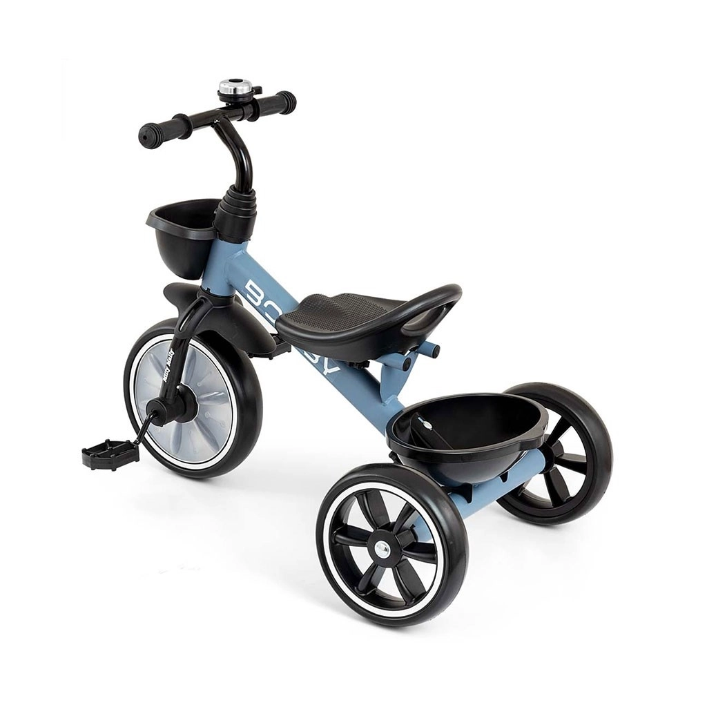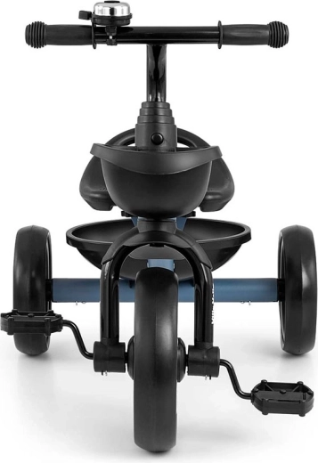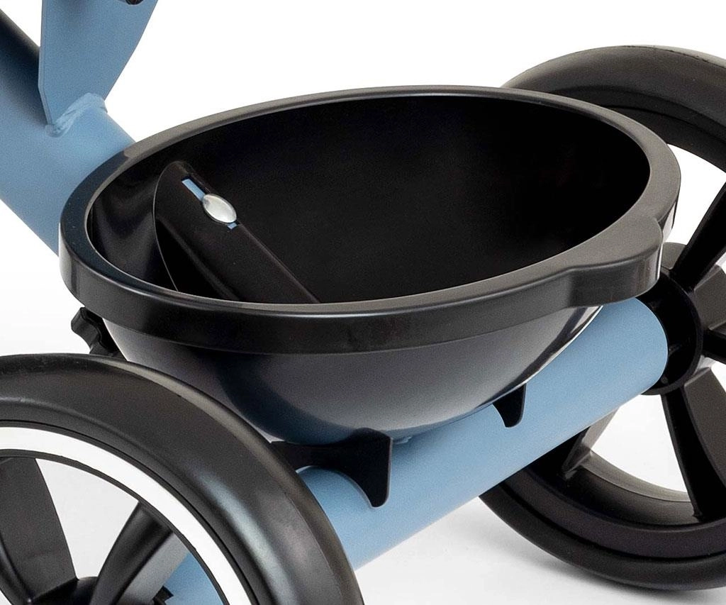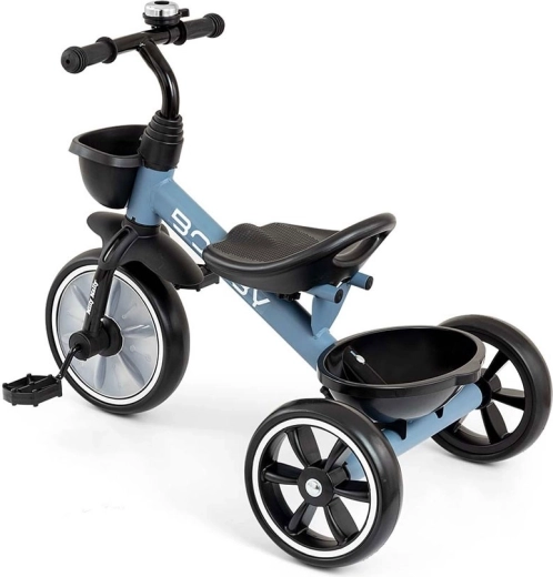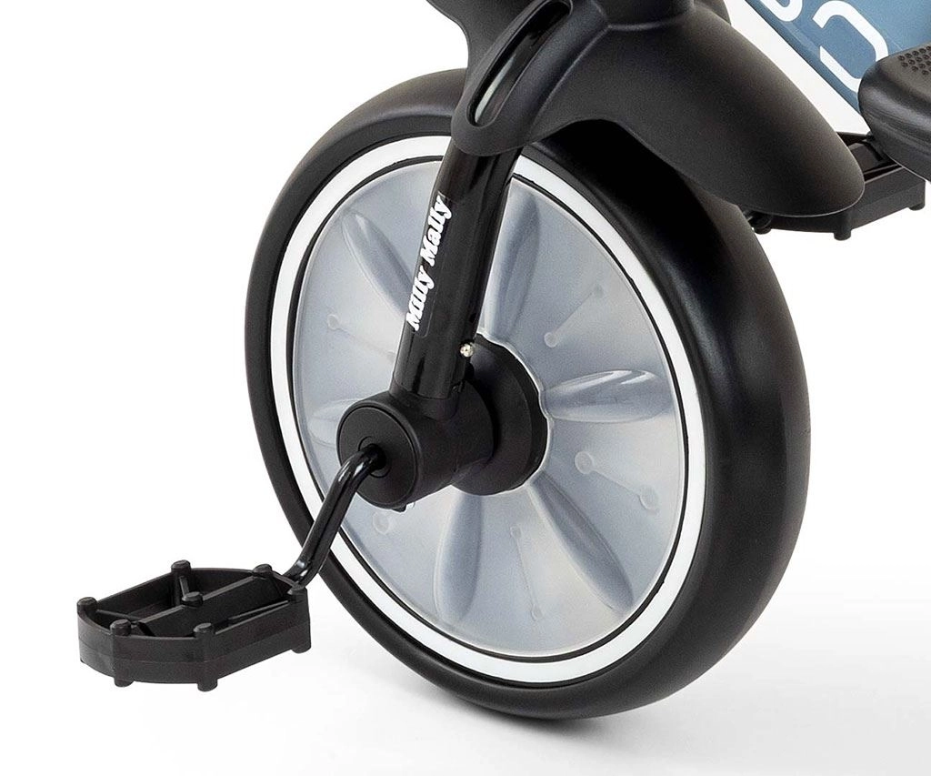 Důmyslné řešení s odnímatelnými pedály umožňuje používat model jako odrážedlo i klasickou trojkolku. Ochrana předního kola brání zachycení nožiček, protiskluzové rukojeti s koncovkami zvyšují bezpečnost úchopu a blatník chrání před nečistotami. Dva košíky – vpředu i vzadu – poskytnou místo pro hračky a drobnosti.