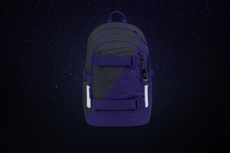 Voděodolný materiál s certifikací GRS, kvalitní zipy YKK a reflexní prvky pro viditelnost. Přední popruhy snadno upevní skateboard.