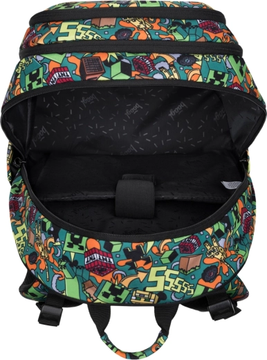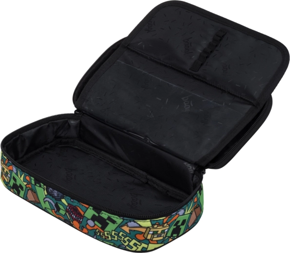 Penál s dvojitou výklopnou chlopní poskytuje přehledné uložení psacích potřeb, má vnitřní kapsu a okénko na rozvrh. Sáček z pevného omyvatelného materiálu se stahuje tkanicemi, které umožňují i nošení na zádech. Celý set ladí v energickém herním designu MINECRAFT Chaos a využívá odolné zipy YKK a recyklované materiály.