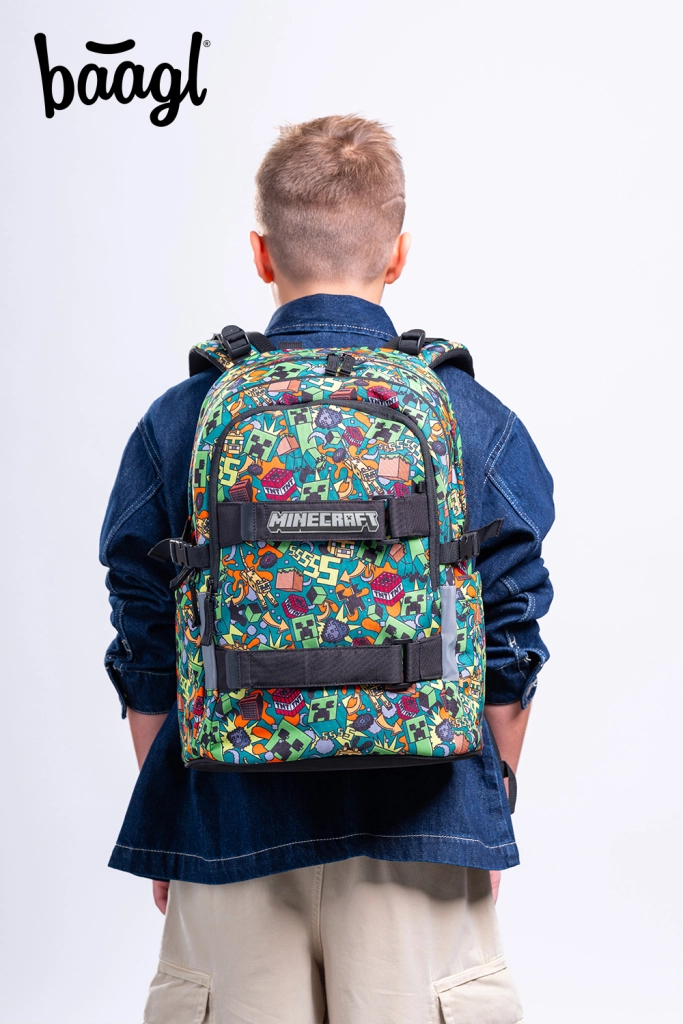 Školní set BAAGL Skate MINECRAFT Chaos je navržen pro pohodlné každodenní nošení od 3. třídy ZŠ. Batoh s hmotností do 900 g nabízí tři komory, vnitřní organizér a polstrovanou kapsu na 15" notebook či tablet. Díky anatomicky tvarovaným zádům, plně nastavitelným kompresním popruhům a reflexním prvkům je vhodný pro školu i volný čas.
