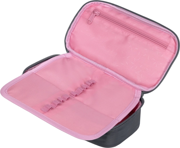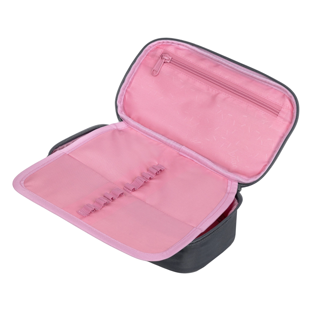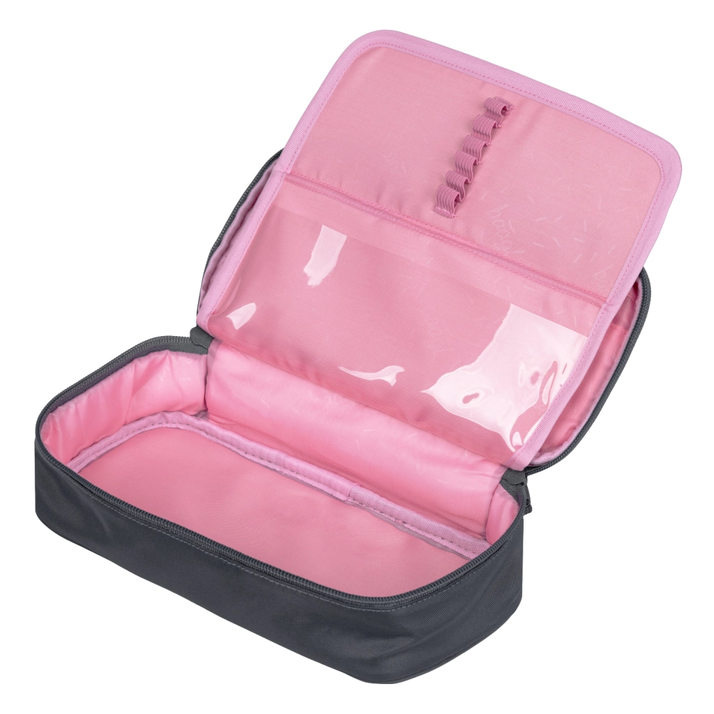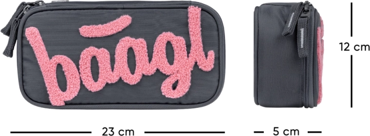 Praktický penál BAAGL v elegantní tmavě šedé s růžovým logem kombinuje moderní vzhled a chytré členění. Hlavní komora je dostatečně prostorná na psací potřeby i drobnosti, zatímco dvojitá výklopná chlopeň s pružnými poutky udrží vše přehledně na svém místě. Nechybí ani vnitřní kapsa a průhledné okénko na rozvrh hodin pro rychlou orientaci během školního dne.