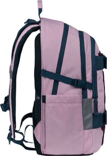 Set Skate Rose je navržen pro pohodlné nošení a chytrou organizaci školních i volnočasových věcí. Batoh s hmotností do 900 g má anatomicky tvarovaná záda, bederní výztuž, tři komory s organizérem a polstrovanou kapsu na 15" notebook. Nechybí postranní kapsy na láhev, kompresní popruhy a popruhy na uchycení skateboardu. Recyklovaný voděodolný materiál doplňují reflexní prvky a spolehlivé zipy YKK.