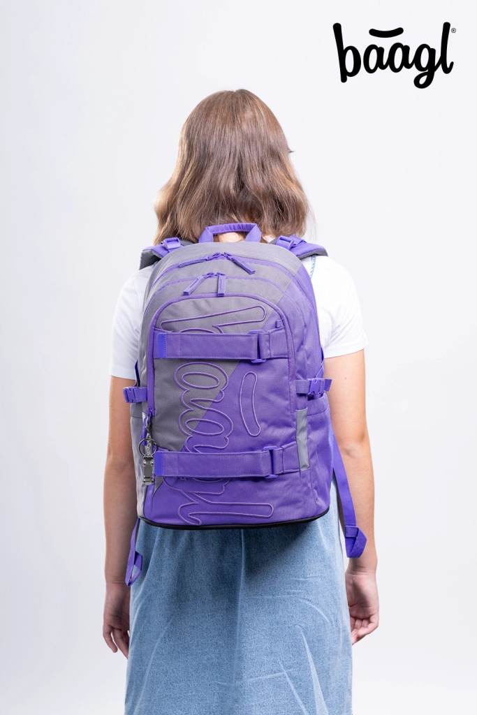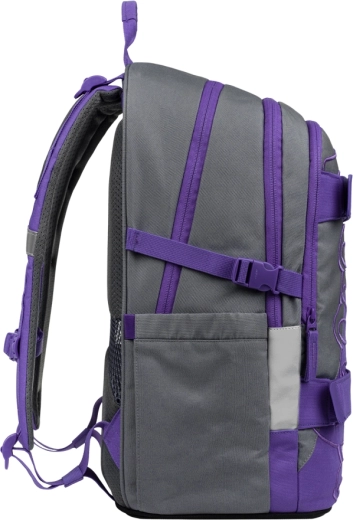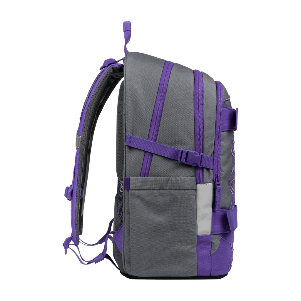 Kompletní školní výbava v jednotném designu DUAL: ergonomický batoh s třemi komorami a organizérem, skládací sportovní taška pro tréninky či víkendové výlety, ledvinka pro bezpečné nošení drobností a dvojitý penál s přehledným uspořádáním. Celý set je sladěn do moderních fialovo‑šedých tónů a vyráběn z recyklovaných, voděodolných materiálů s důrazem na dlouhou životnost.