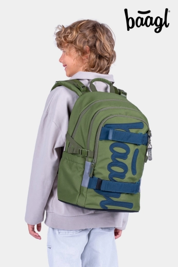 Praktická školní sada BAAGL Skate Olive kombinuje lehké a odolné vybavení pro žáky od 3. třídy ZŠ až po studenty. Set zahrnuje ergonomický batoh s uchycením na skateboard, prostorný penál, skládací sportovní tašku, ledvinku na nezbytnosti a obal/organizér na příslušenství či notebook. Vše je z recyklovaných, voděodolných materiálů s reflexními prvky a spolehlivými zipy YKK, podpořeno certifikací GRS.