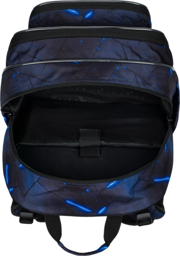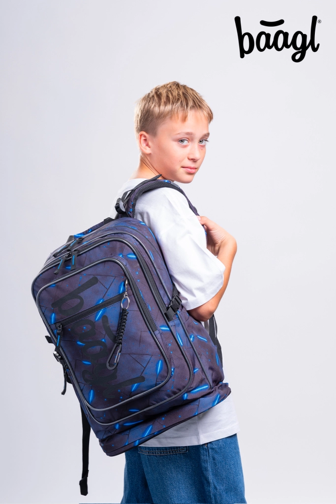 Školní set BAAGL Cubic Flash v tmavě modrém geometrickém designu se světlými akcenty elegantně sladí veškeré školní i volnočasové vybavení. Hlavní hvězdou je ergonomický batoh s třemi komorami, promyšleným organizérem, vyztuženou tajnou kapsou a bezpečnými reflexními prvky. Díky nízké hmotnosti 1 200 g, nastavitelným ramenním, prsním i kompresním popruhům a prodyšnému zádovému panelu se pohodlně nosí po celý den.