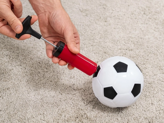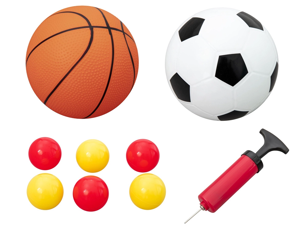 Součástí sady je ruční pumpička a různé míče – mini basketbal, mini fotbal a malé házecí míčky. Stačí nafouknout a hrát.