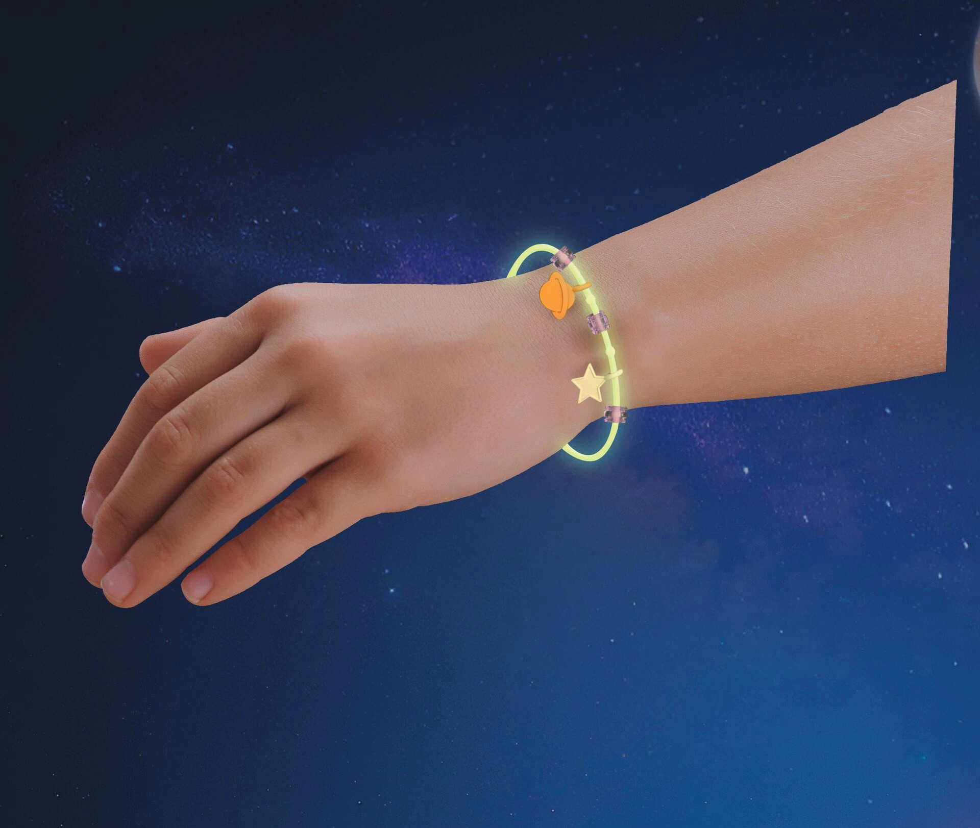 - Kreativní prvek: silikonový náramek s možností zdobení (korálky a přívěsky), který svítí ve tmě