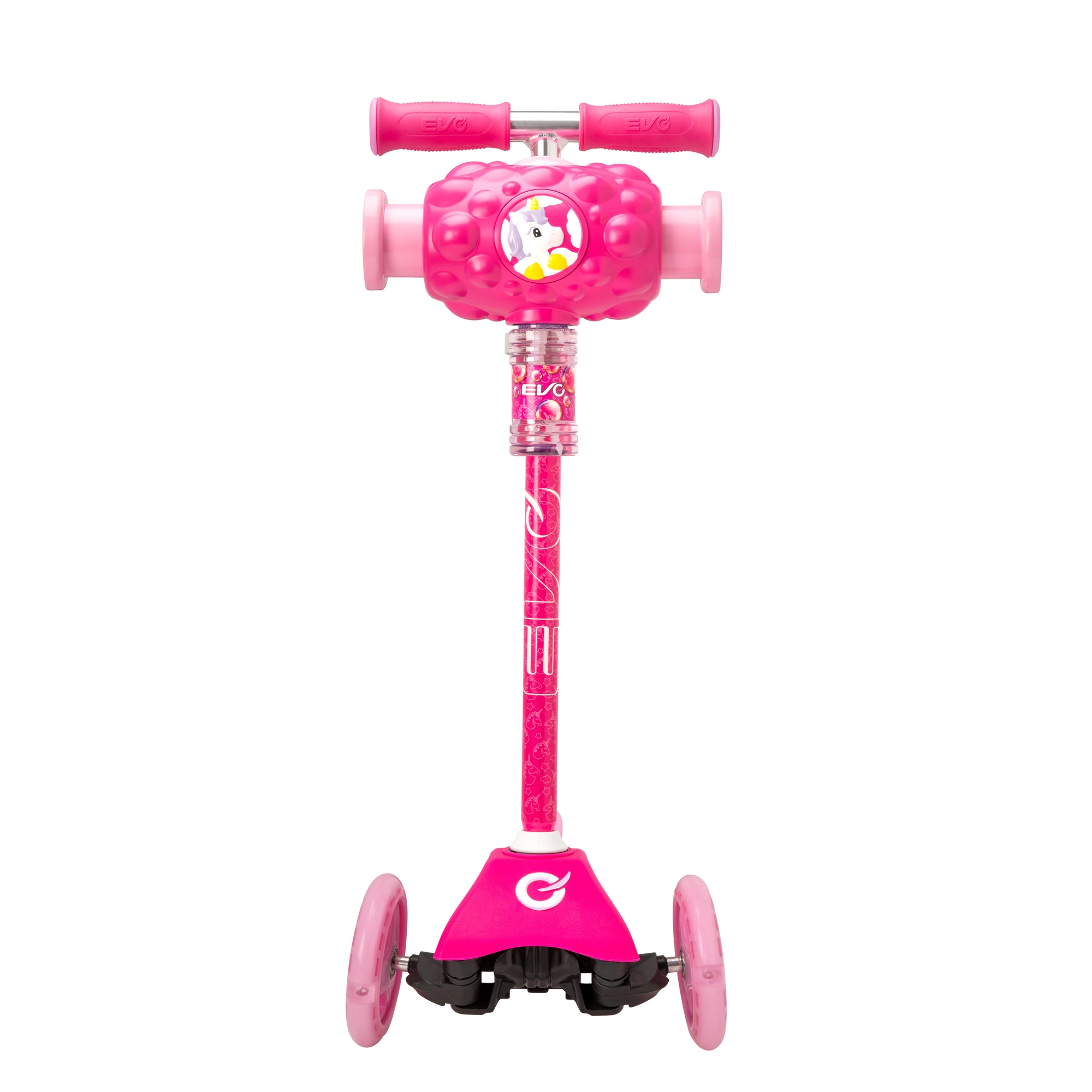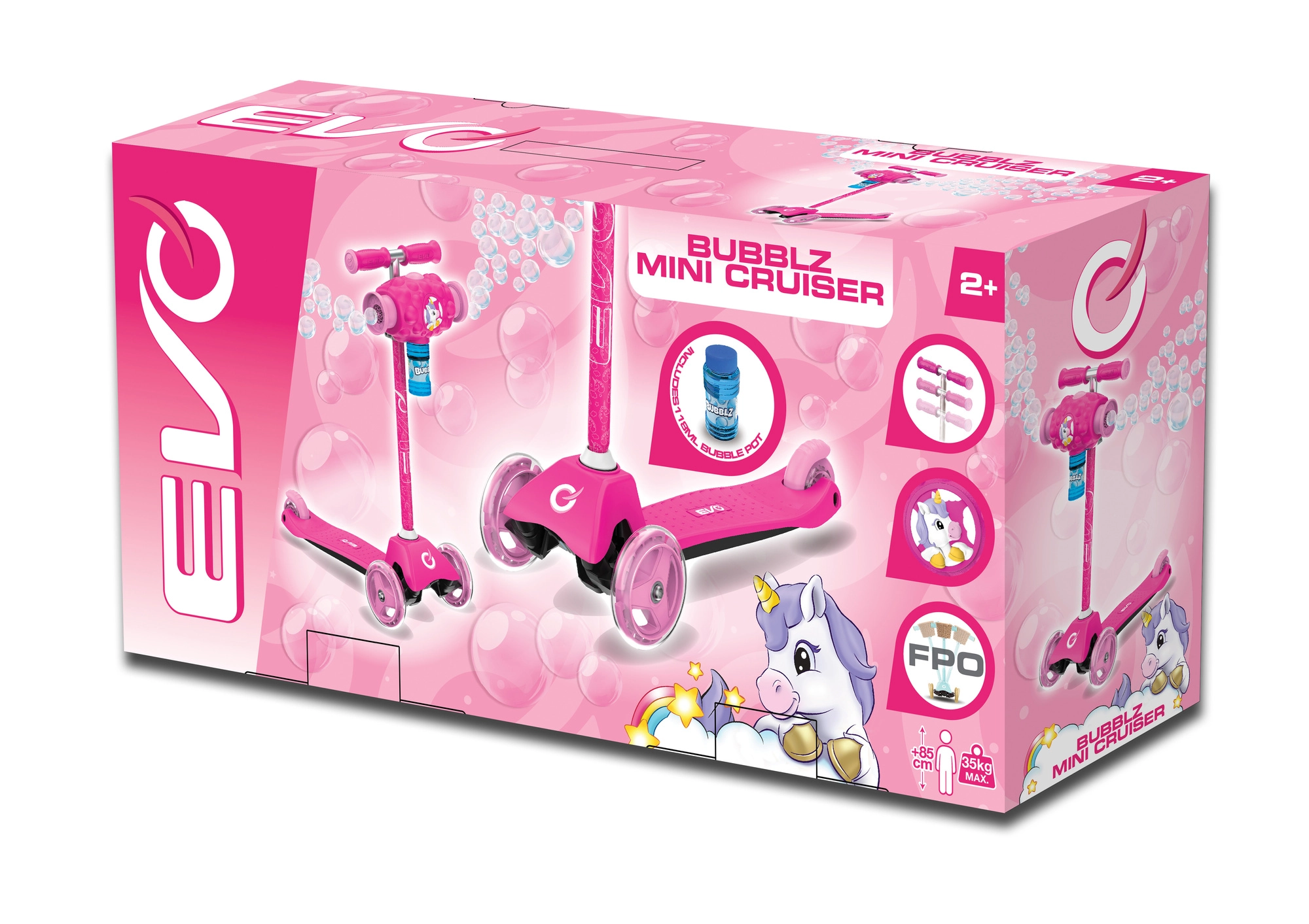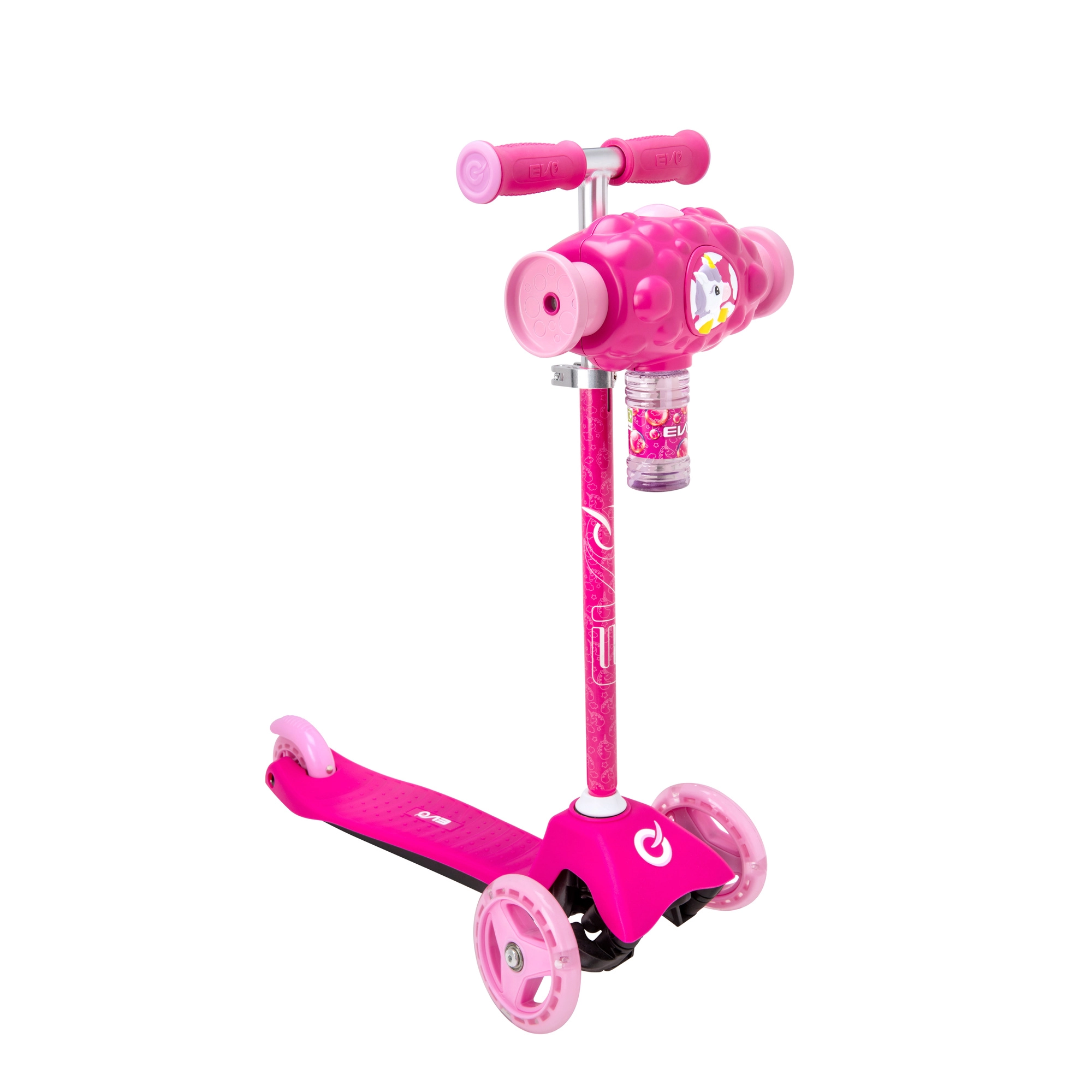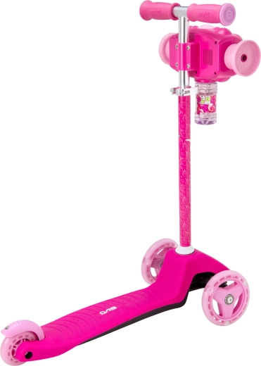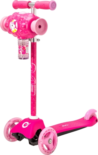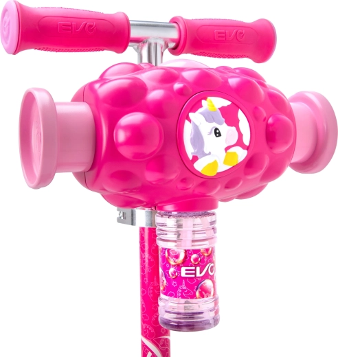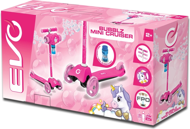 Zábavná a stabilní dětská koloběžka EVO Bubblz Mini Cruiser s třemi kolečky, balančním řízením a nastavitelnou řídítkovou tyčí. Vestavěný bublinkovač vykouzlí během jízdy spoustu bublinek, což děti nadchne. Široké stupátko s protiskluzem, zadní nožní brzda a ložiska ABEC-5 zajistí pohodlnou a tichou jízdu. Ideální pro děti od 3 let a pro rozvoj rovnováhy a koordinace.