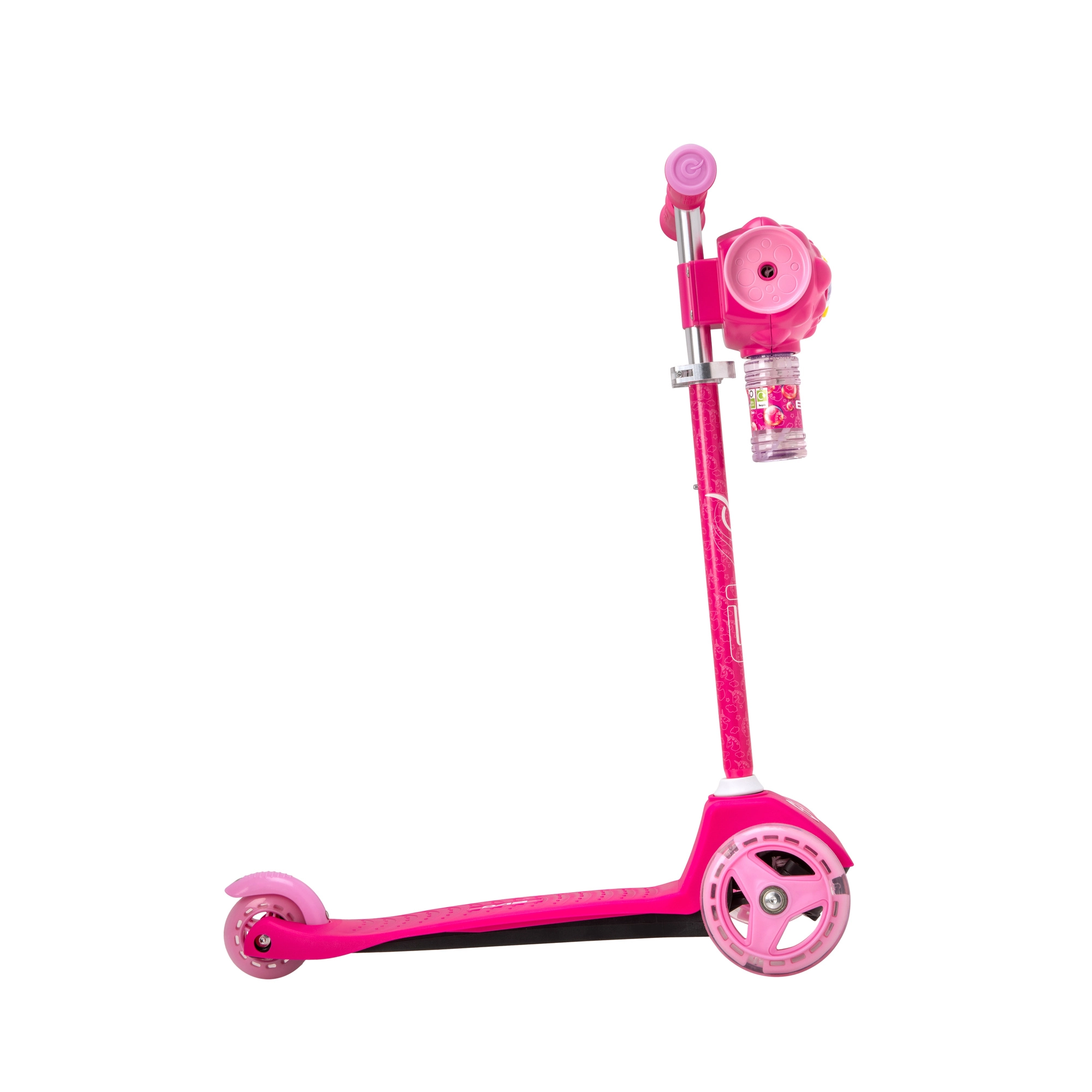Skutečnou atrakcí je integrovaný bublinkovač, který při jízdě vytváří bublinky a promění každou projížďku v radostnou zábavu. Protiskluzová nášlapná plocha, měkké TPR rukojeti a zadní nožní brzda zvyšují jistotu i pohodlí při ovládání.
