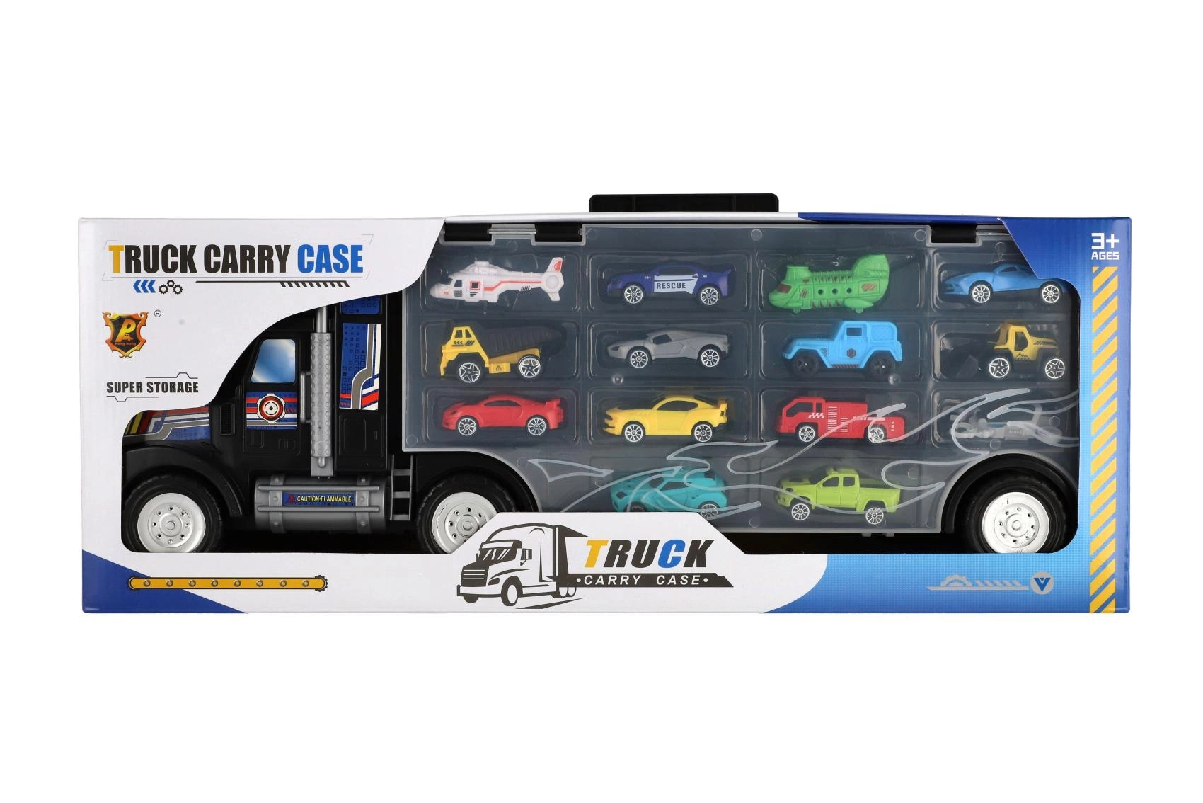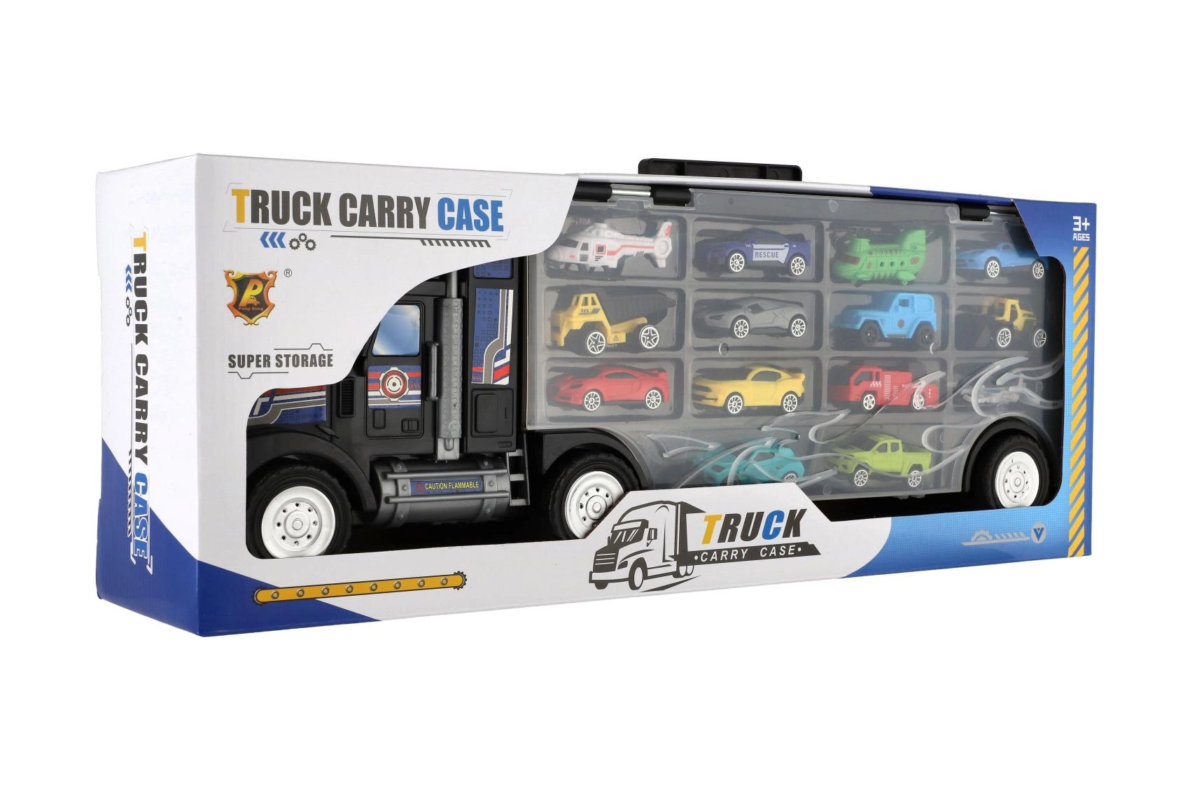 Součástí balení je 14 pestrých modelů – od sportovních a terénních vozů přes pracovní stroje až po záchranářská vozidla. Otevíratelný panel umožňuje rychlý přístup, kolečka kamionu se volně otáčejí a horní rukojeť zajišťuje pohodlné přenášení.