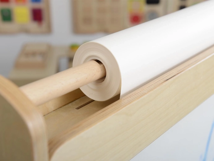 Pevný rám z přírodního dřeva a kolečka s aretací zaručují stabilitu i snadné přemístění mezi učebnou, hernou či ateliérem.
