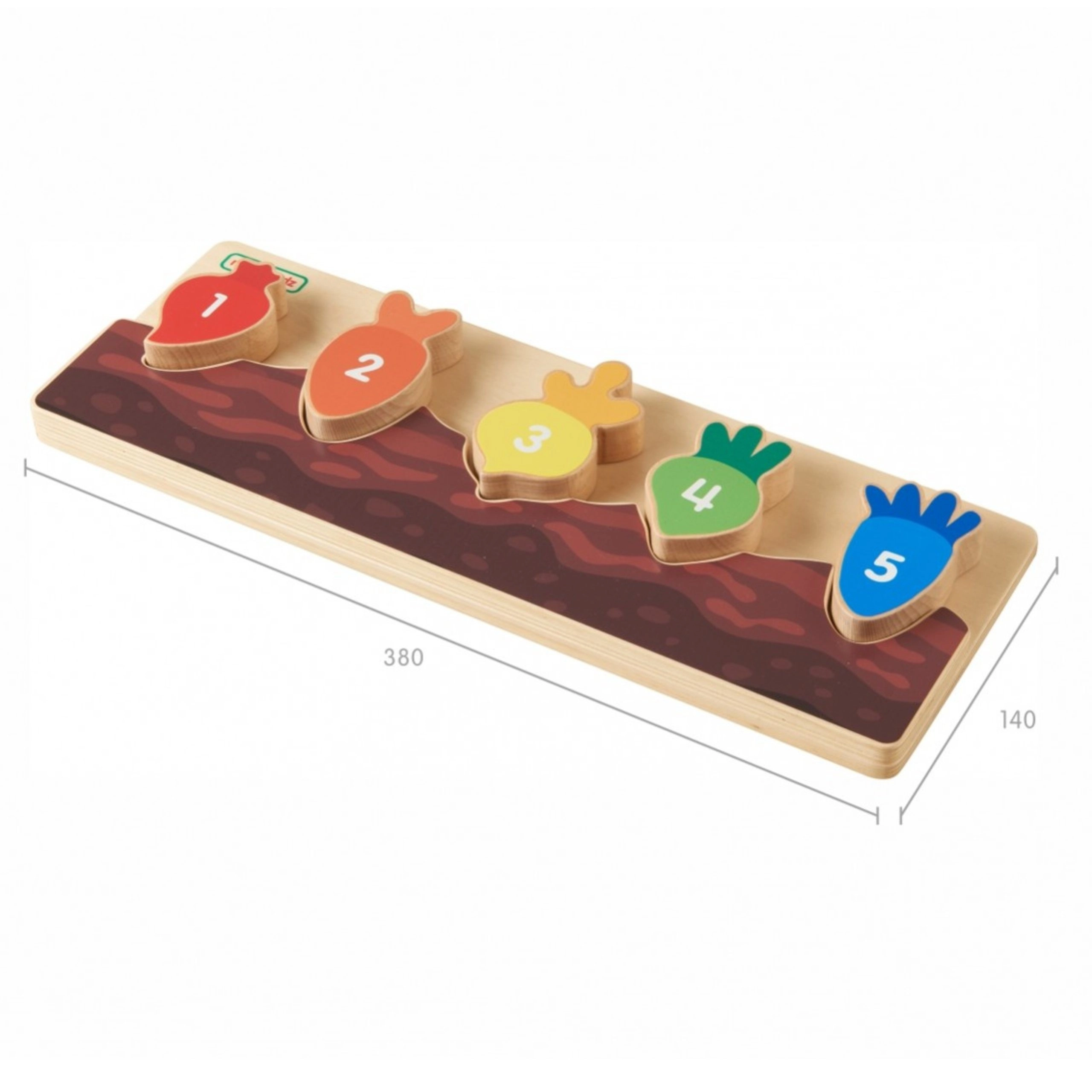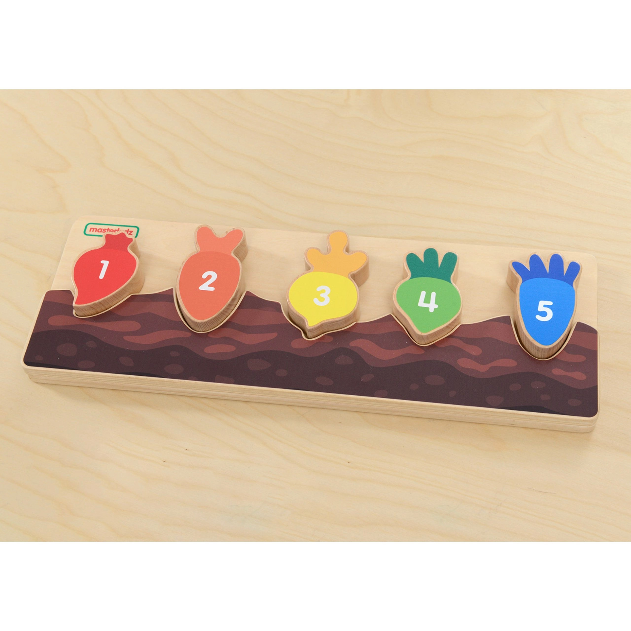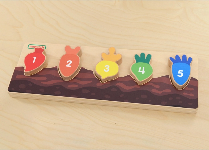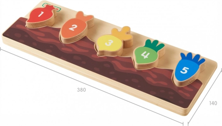 Každý barevný kousek zeleniny je označen číslem a pasuje pouze do svého výřezu. Děti si přirozeně procvičí počítání a sekvenci 1–5.