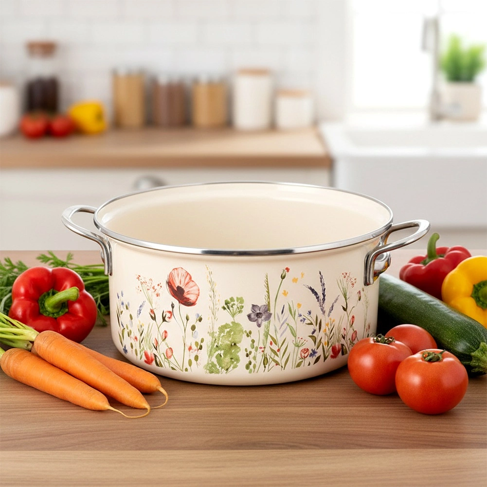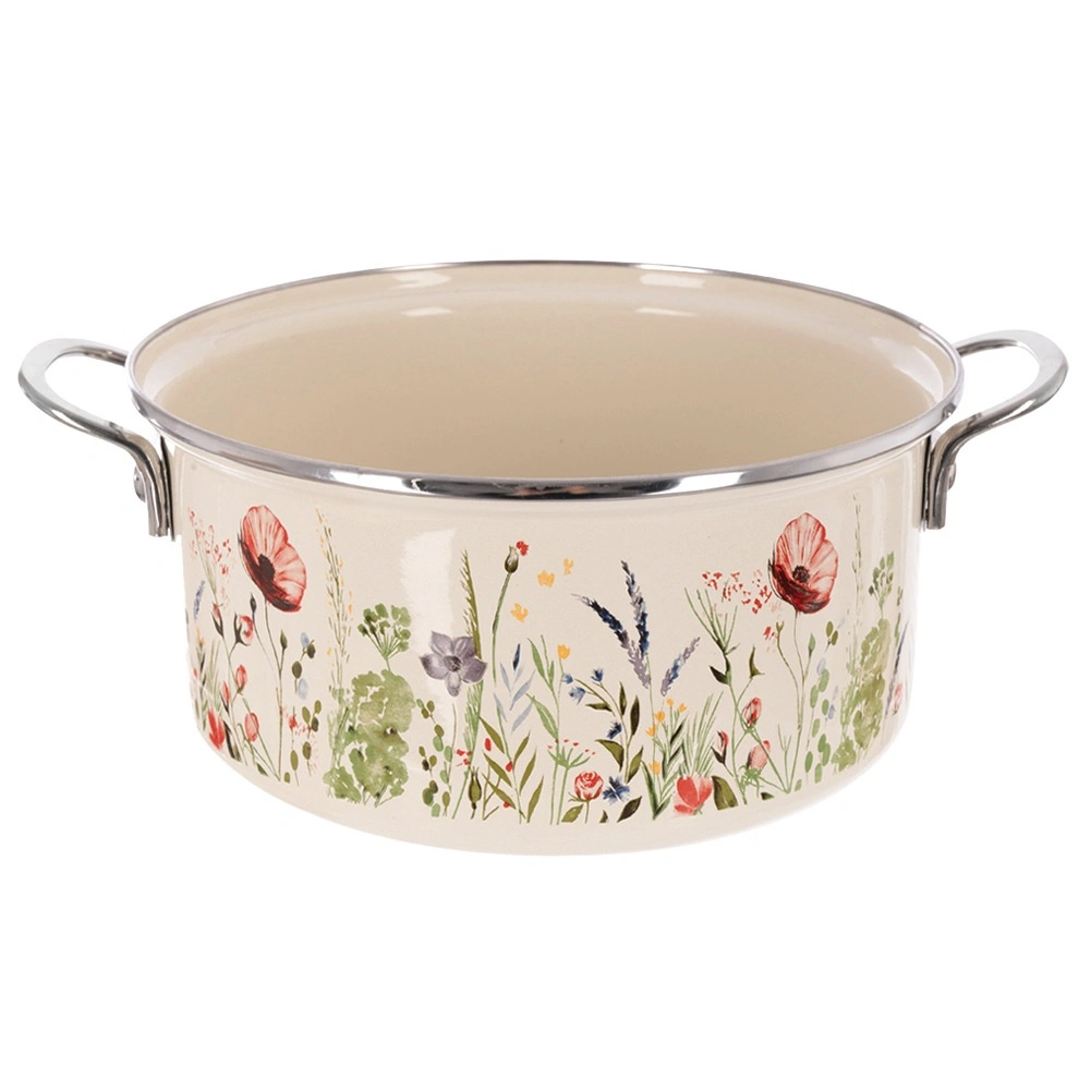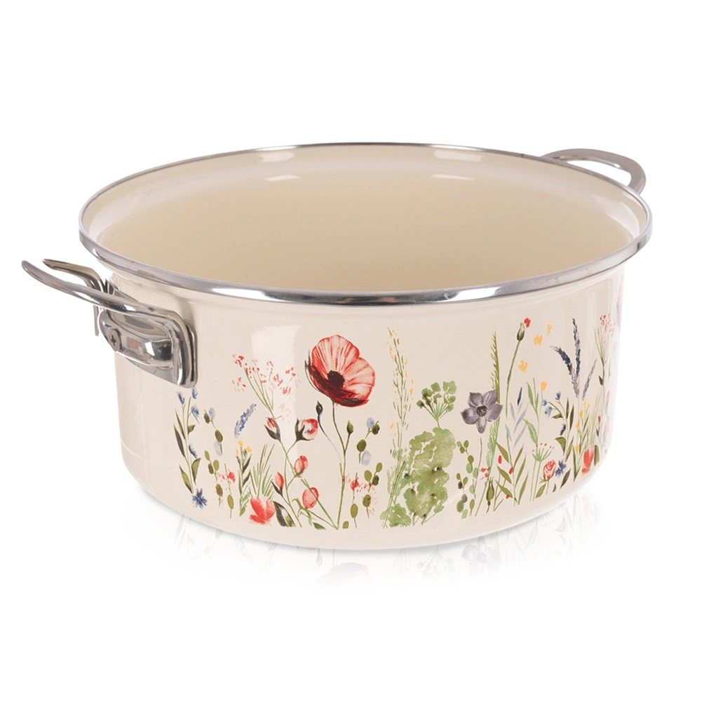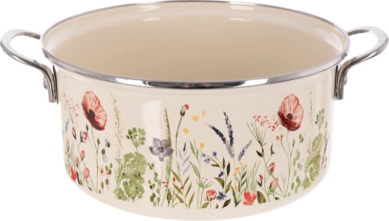 Oblíbený hrnec v retro stylu kombinuje odolnost smaltu a každodenní praktičnost. Objem 5 l, průměr 26 cm a výška 12 cm poskytují dostatek prostoru pro polévky, omáčky i rodinné porce. Krémové provedení s květinovým dekorem ozdobí kuchyň i stůl, takže v něm můžete pokrmy rovnou servírovat.