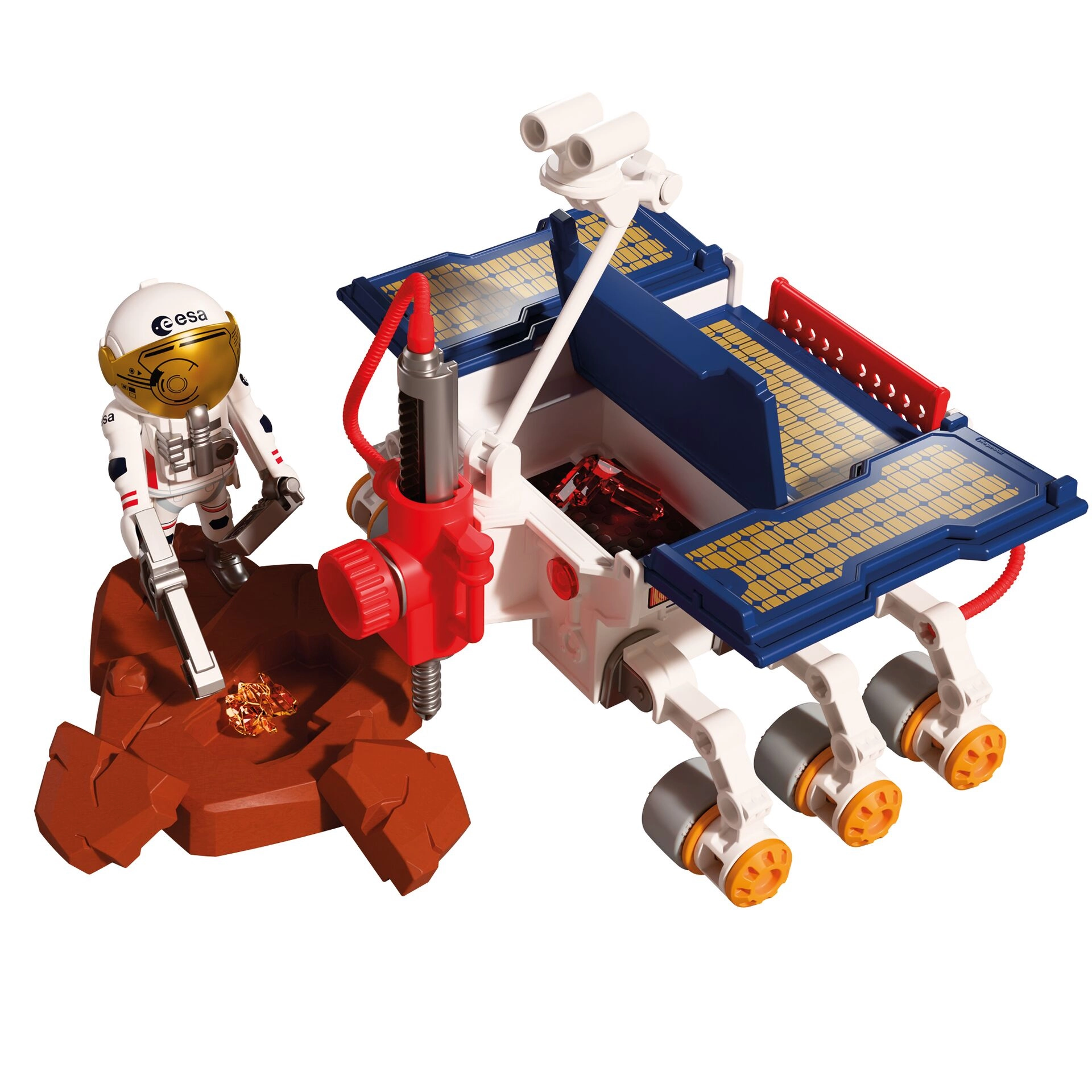 Objevujte rudou planetu s realistickým setem PLAYMOBIL vytvořeným ve spolupráci s Evropskou kosmickou agenturou (ESA). Robustní marsovský rover s vrtacím modulem, kamerami, čidly a výklopnými solárními panely umožní dětem prozkoumávat terén, sbírat vzorky a zažít autentickou vědeckou expedici. Pohyblivé části a funkční doplňky podporují kreativní hraní rolí a rozvoj fantazie.