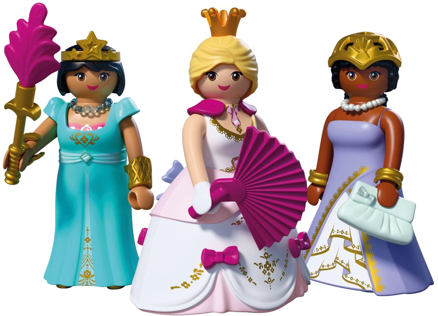 Tři okouzlující princezny zvou děti do světa královských dobrodružství. Díky vyměnitelným šatům, sukním a šperkům mohou malí tvůrci snadno měnit vzhled postaviček a vymýšlet stále nové příběhy – od velkolepého bálu až po procházky zámeckými zahradami.