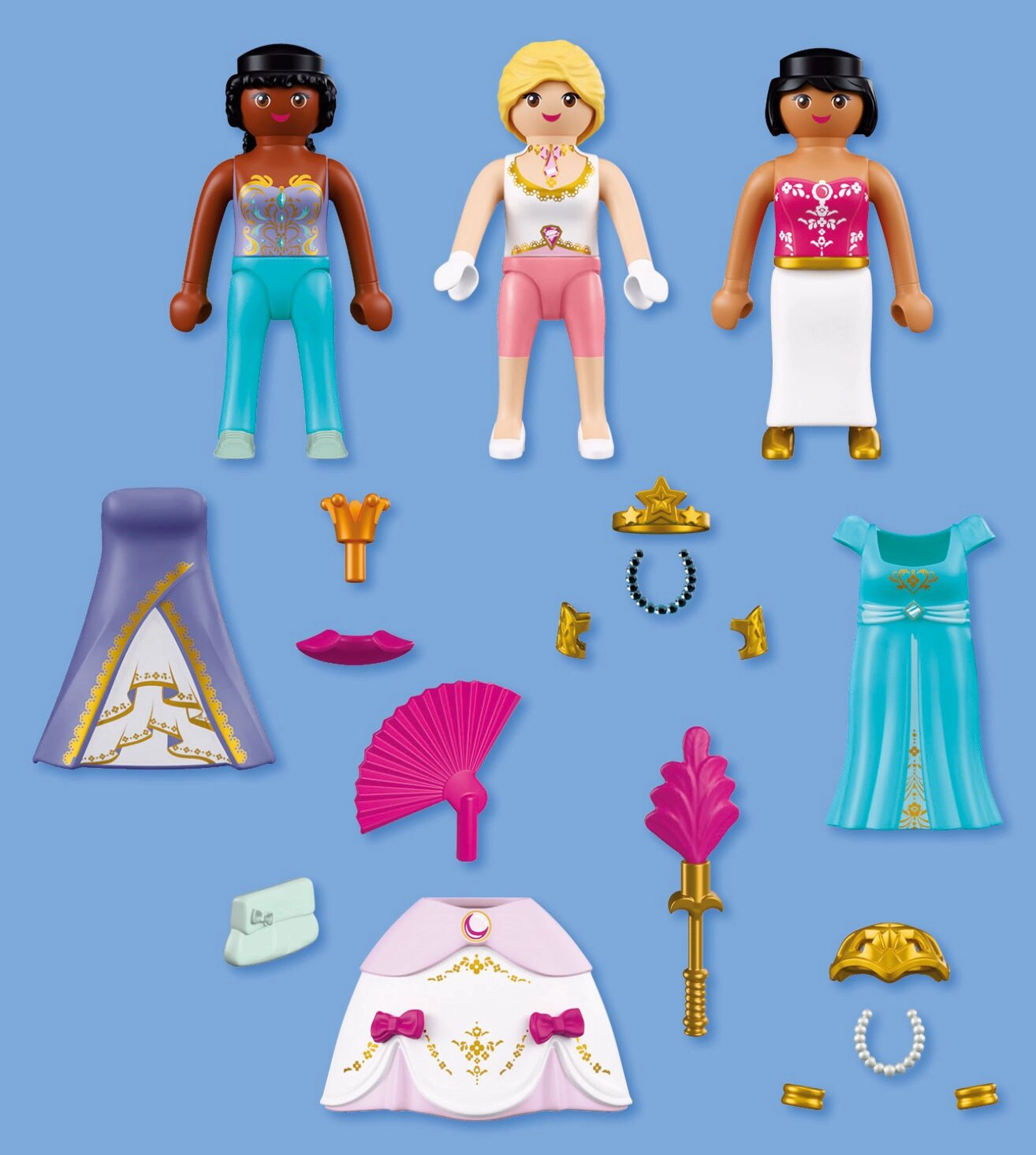 - Obsah balení: 3 figurky princezen (cca 7,5 cm), 2 šaty, sukně, koruna, koruna s hvězdou, síťka do vlasů, vějíř, límec, 2 náhrdelníky, berlo s pírkem, 2 náramky, 2 manžety