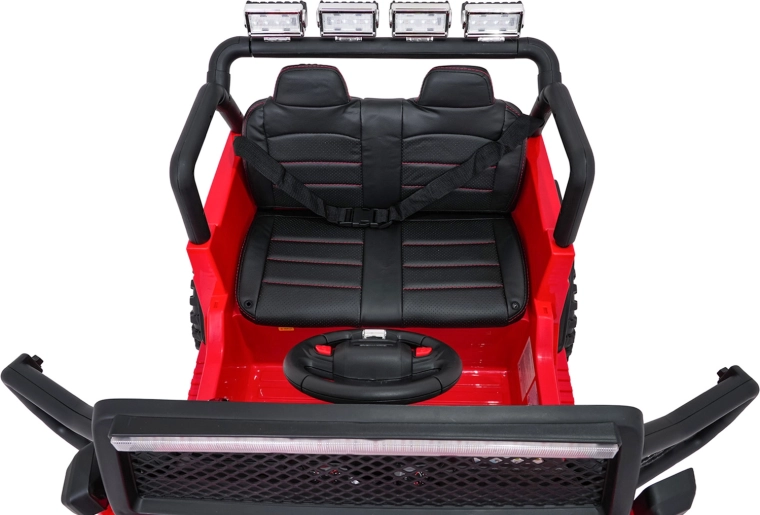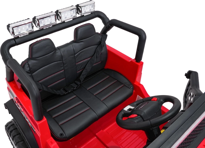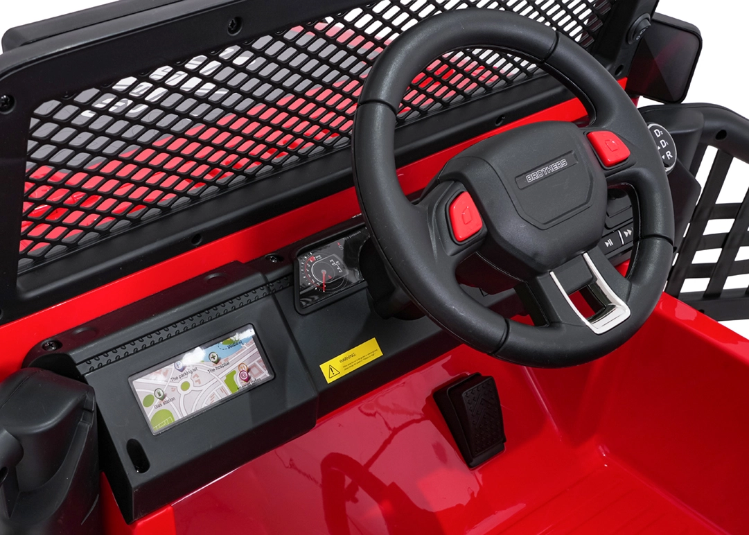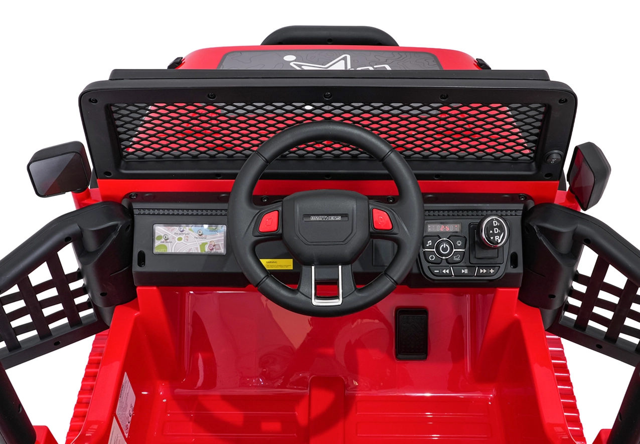 Silný a stylový dětský terénní vůz pro dvě děti s pohonem 4x45 W, dvojitou baterií 2× 12 V 7 Ah, měkkými EVA koly a luxusním sedadlem z ekokůže. Nabízí plynulý rozjezd, dvě rychlosti, bohaté LED osvětlení, otevírací dveře a moderní audio panel s Bluetooth, USB, MP3 a FM rádiem. Nosnost až 50 kg a velká světlá výška 23 cm pro skutečné dobrodružství.