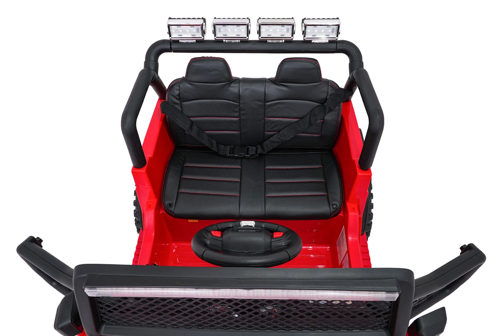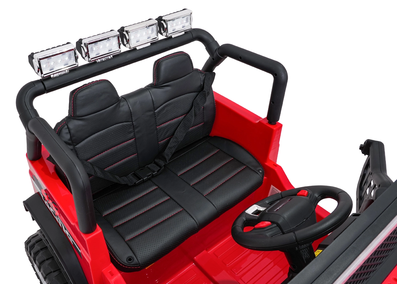 Široké dvoumístné sedadlo z ekokůže s bezpečnostními pásy, plynulý start a odpružení vpředu i vzadu pro hladkou jízdu.