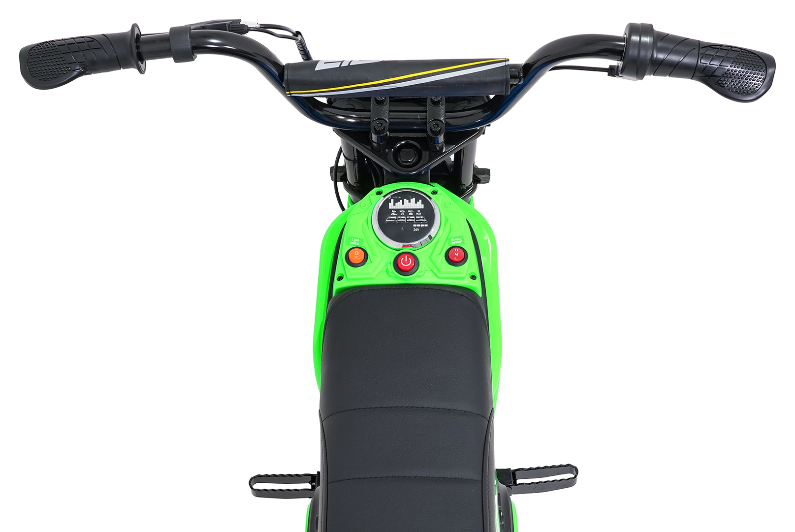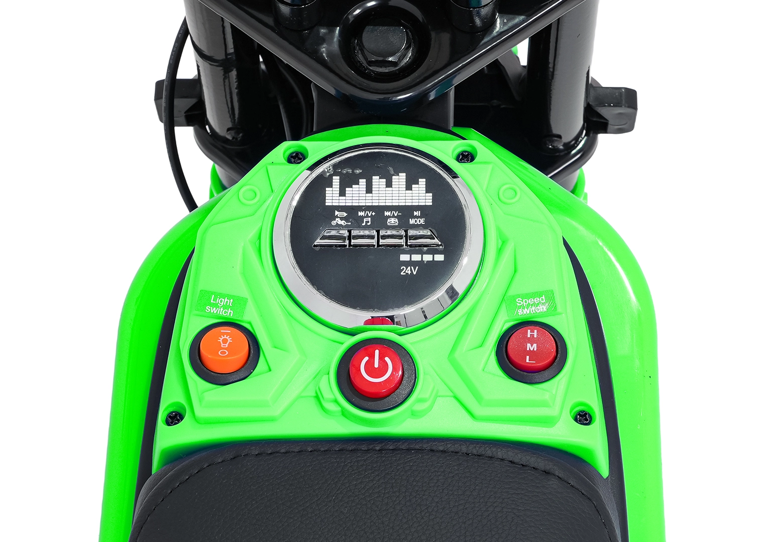 Ovládání je jednoduché a bezpečné: spuštění tlačítkem, volba 3 rychlostí (H/M/L) a přehledné ukazatele stavu baterie. LED světla zvyšují viditelnost, zatímco audio panel s Bluetooth, přednahranými melodiemi, tlačítkem zvuku a klaksonem se postará o další zábavu. Maximální nosnost je 65 kg, takže motorka roste spolu s jezdcem.